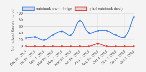 Google Trends data indicates a fluctuating but generally strong interest in “notebook cover design” over the past year, with a notable peak projected for early 2026. “Spiral notebook design” shows significantly less search interest, suggesting that while spiral notebooks are common, the design aspect of their spiral binding is not a primary search query for consumers.
