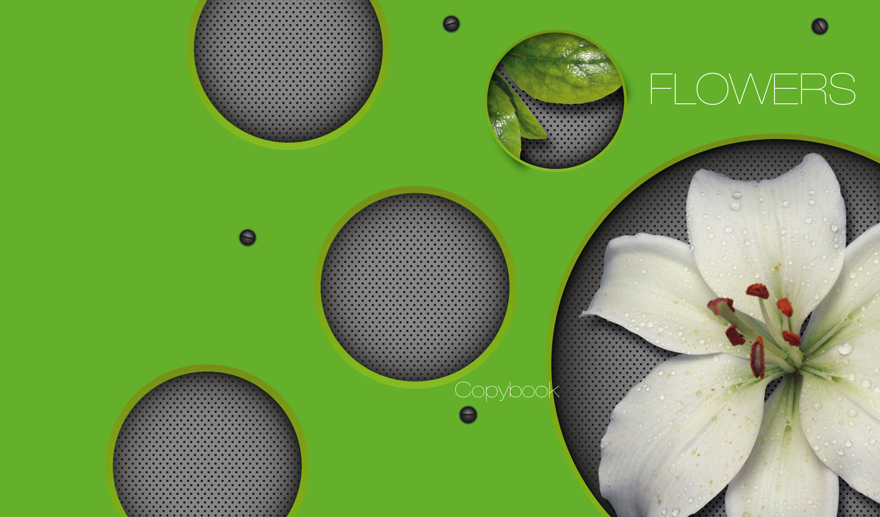 White lily flower in dew drops and green leaves on a black and white polka dot pattern inside green panel hole with screws.