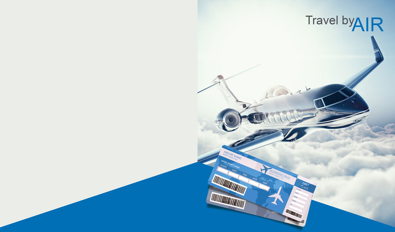 A three-quarter view of a blue-indigo business jet against the blue-white gradient sky on white and blue geometric background with airline tickets.