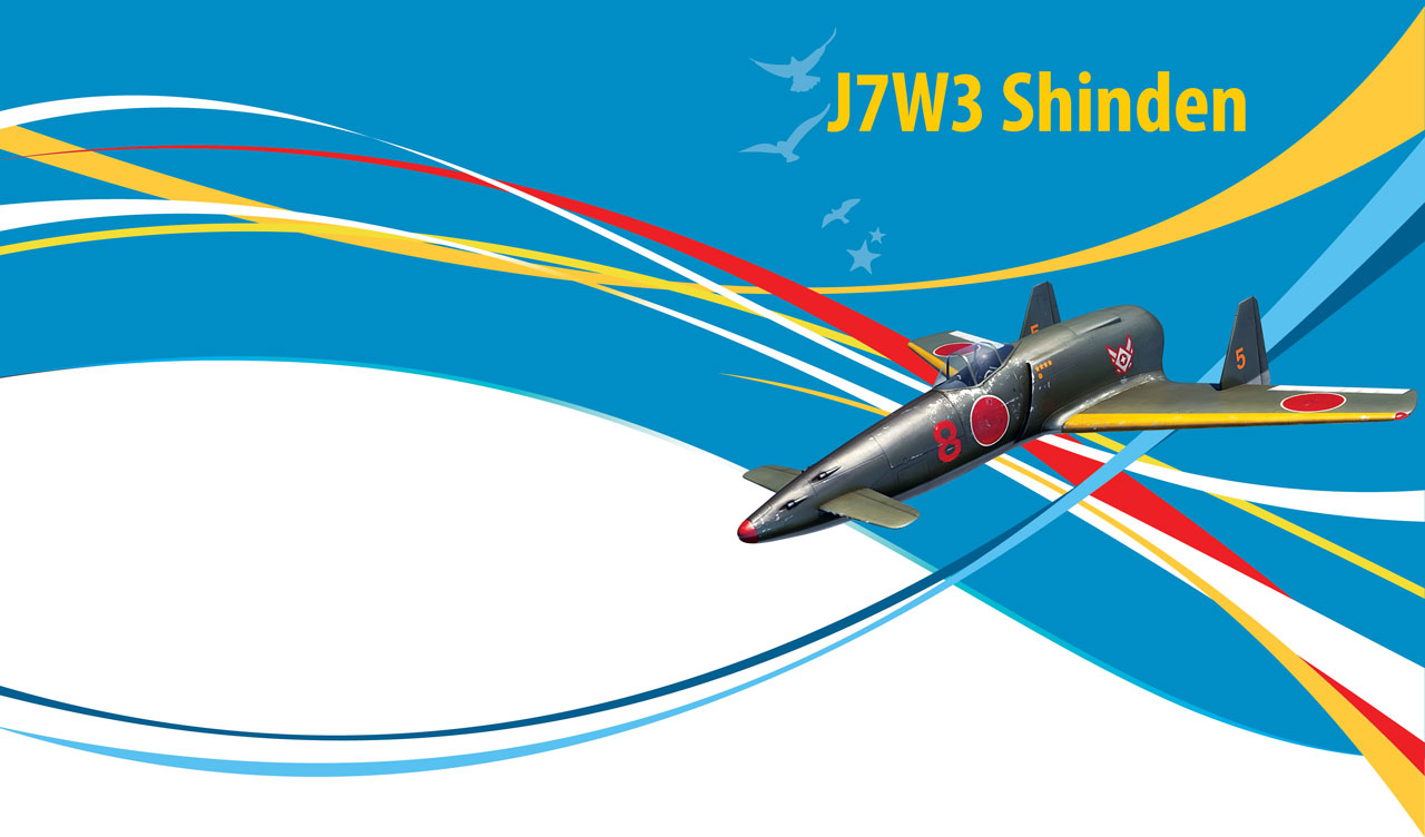 A vintage metal grey Japanese J7W3 Shinden model aircraft with red circles against an abstract light blue and white wavy background.