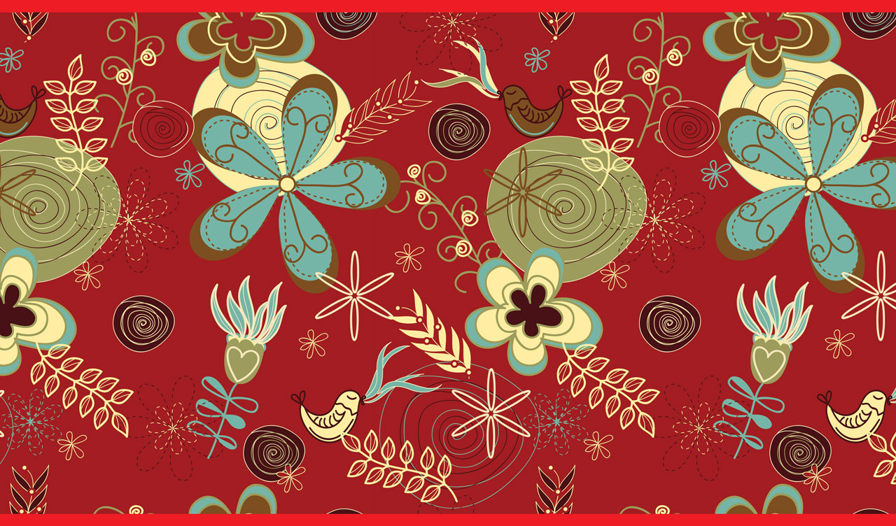 1. Seamless pattern of flowers, leaves, butterflies and snails on ocher-green 2. Seamless pattern of microcosm inhabitants, bacterias and cells on ocher 3. Seamless pattern of flowers, leaves and birds on pastel teal 4. Seamless pattern of flowers, leaves and birds in teal and olive on maroon 5. Seamless pattern of flowers and leaves in dark blue and pink colors on blue
