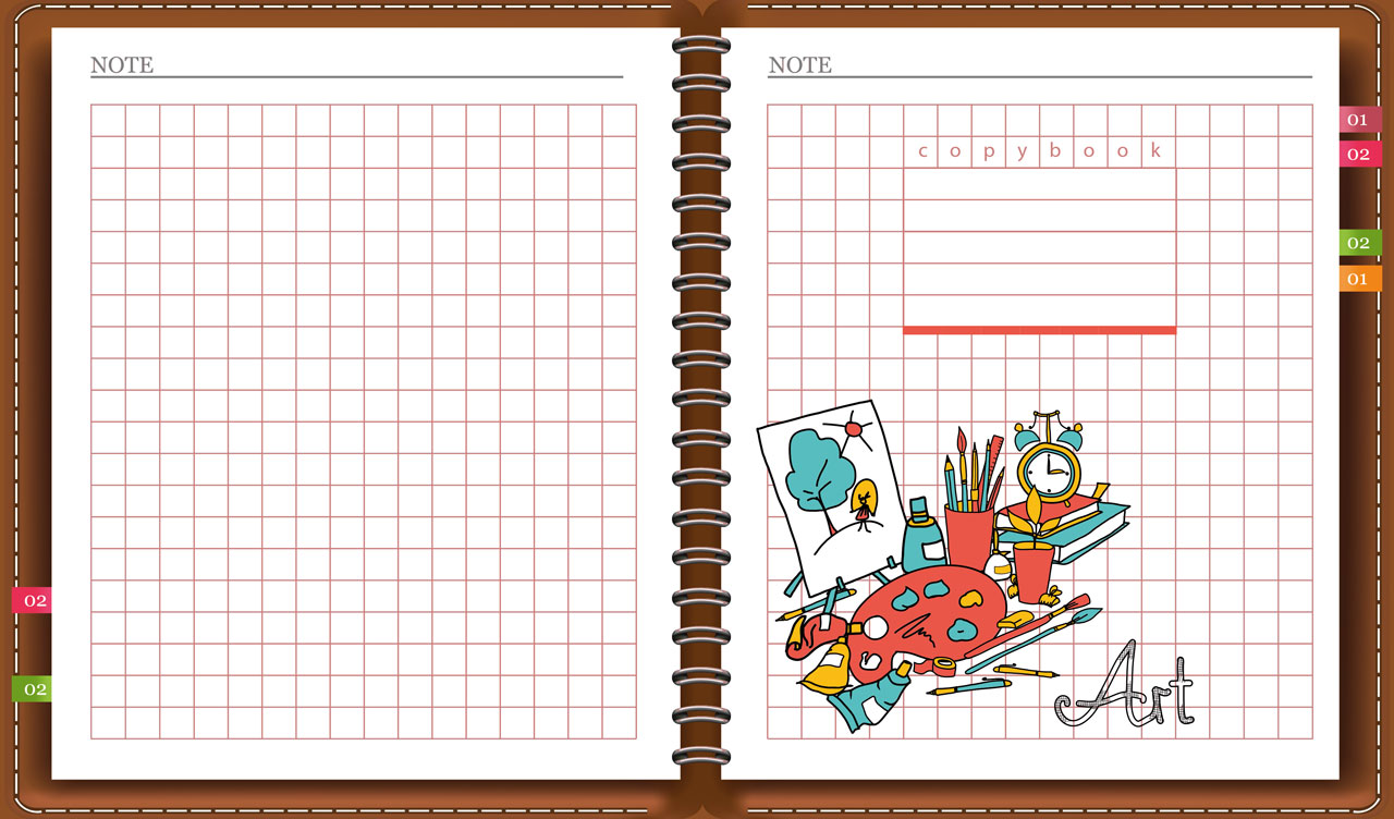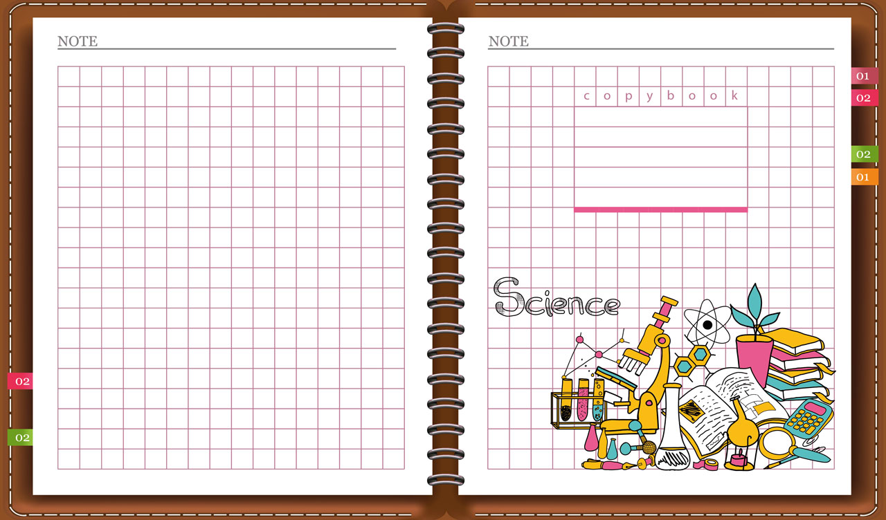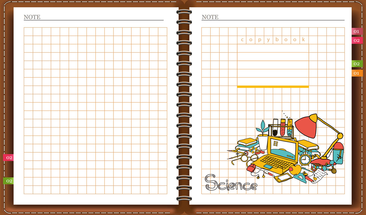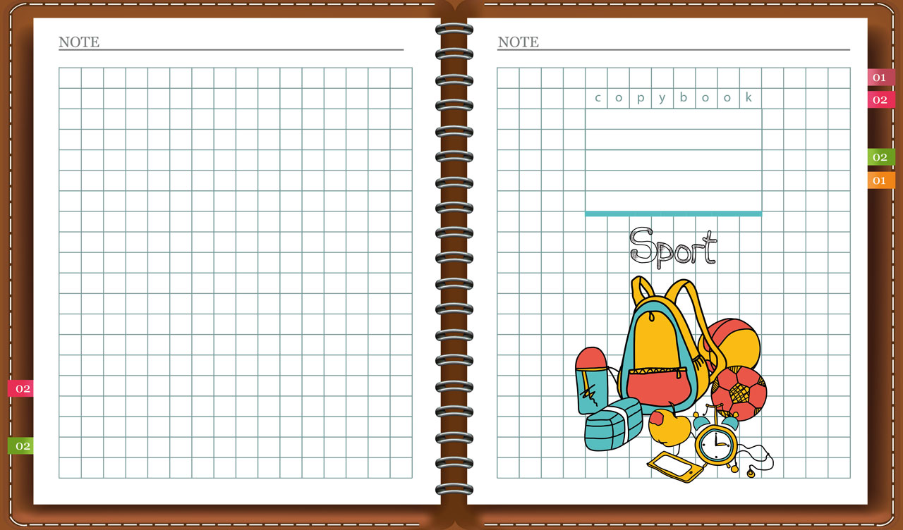 1. Brown spiral notebook with math clipart on a white grid backdrop 2. Brown spiral notebook with sports clipart on a white grid backdrop 3. Brown spiral notebook with art clipart on a white grid backdrop 4. Brown spiral notebook with exact science clipart on a white grid backdrop 5. Brown spiral notebook with natural science clipart on a white grid backdrop