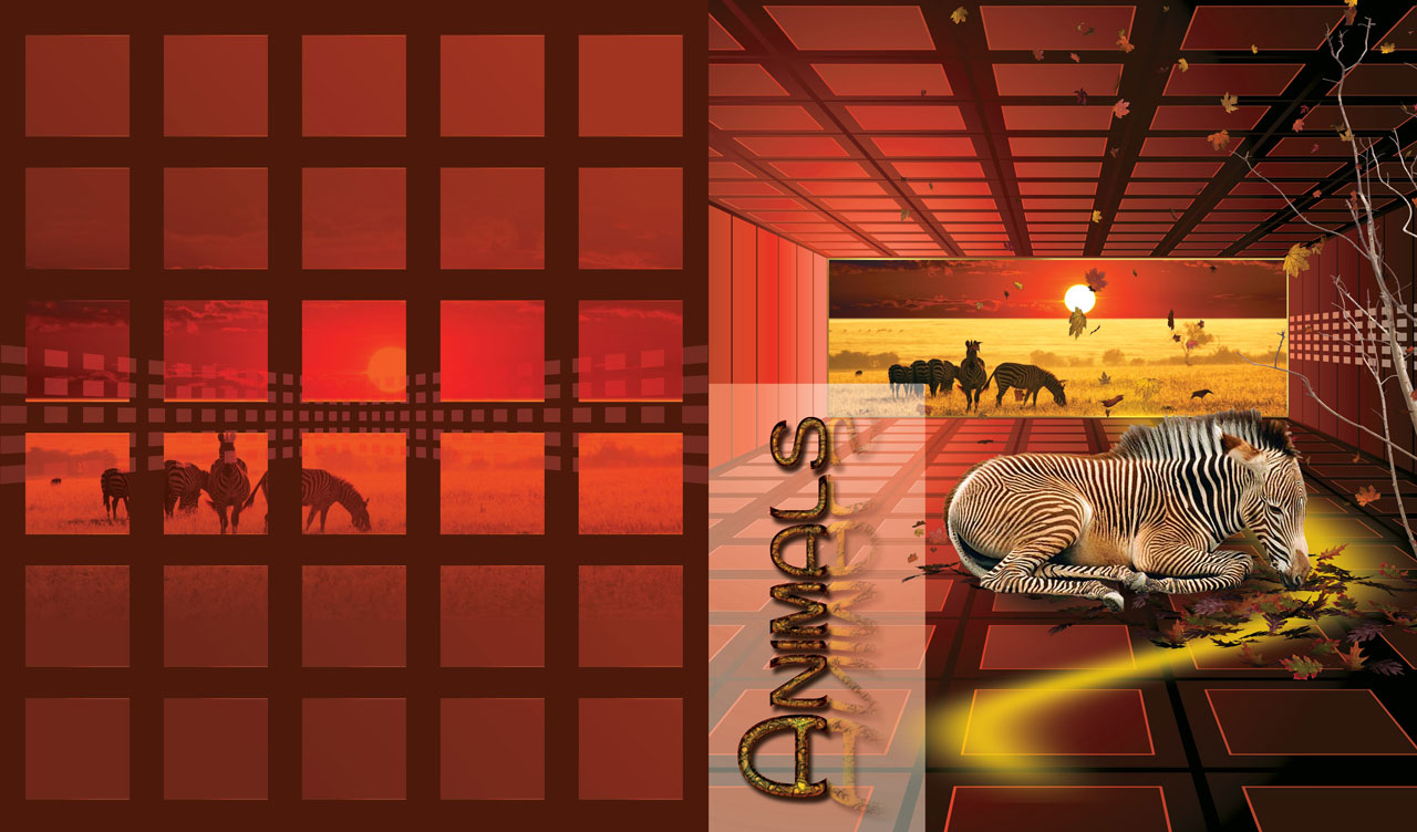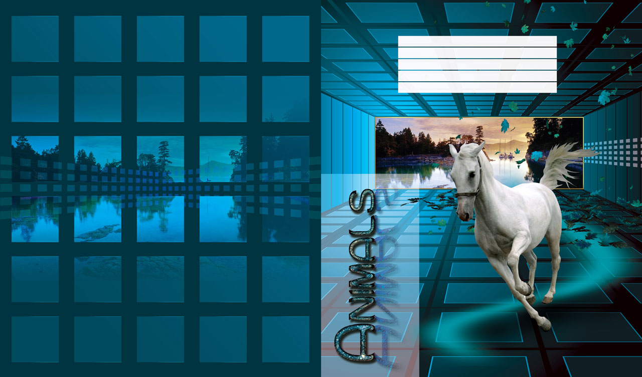 1. A tiger in a green cubic pattern room and a landscape of wild nature is behind it 2. Zebra lies on the floor of a red cubic room and a landscape of a savanna behind it 3. Wolf lies in a green cubic room behind which is a landscape of a green field 4. White horse gallops in a blue cubic room and a landscape of a lake behind it