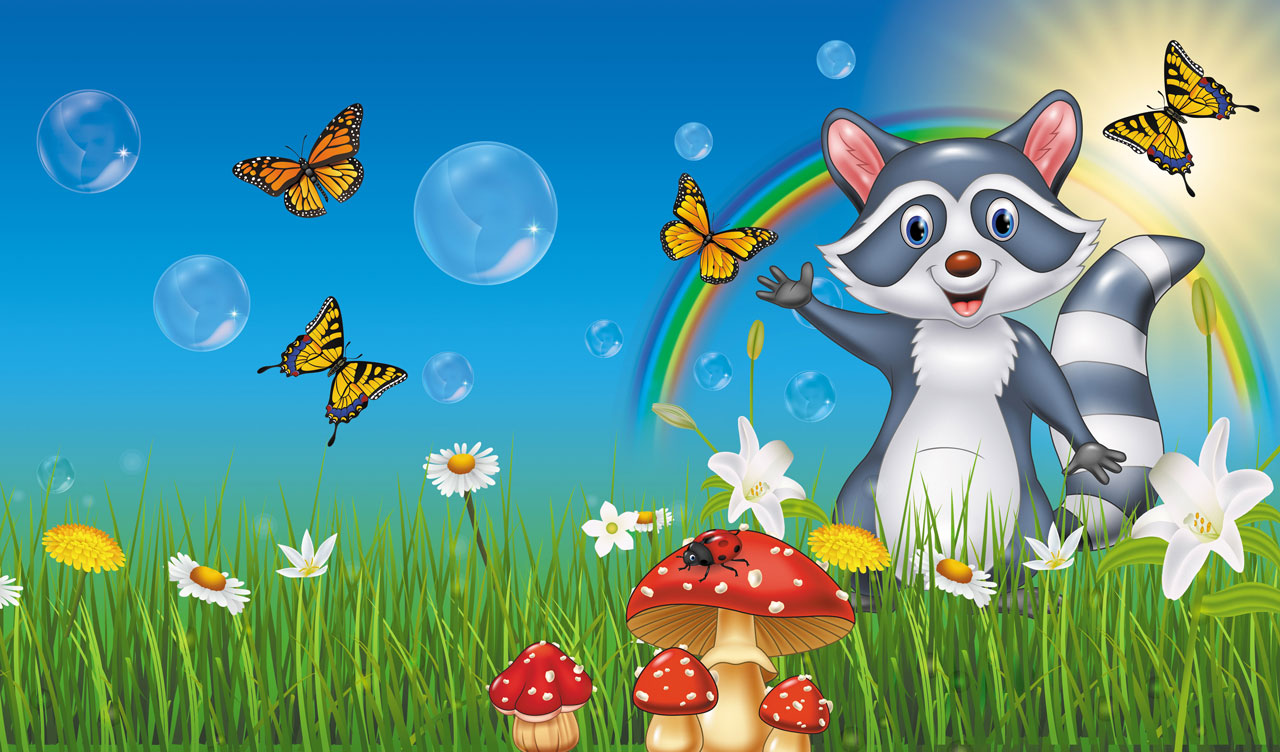 4. Cartoon raccoon under a rainbow in a blue sky in a green field of wildflowers