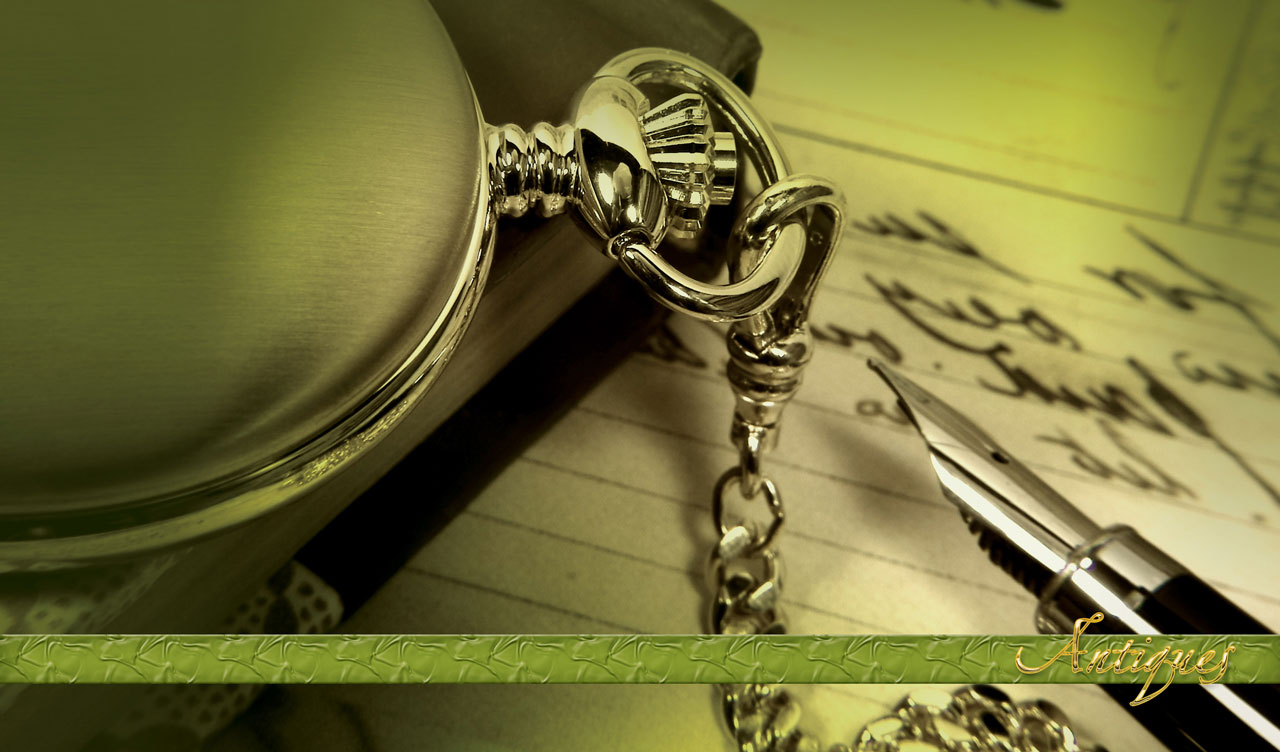 Antiques composition of a pocket watch on notebook, with the chain over a written page and a fountain pen on a lime green background.
