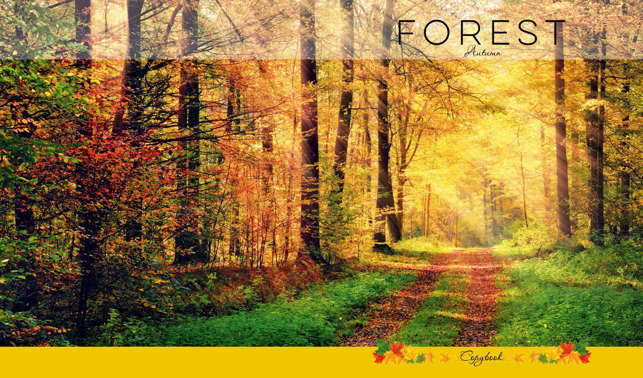1. Sunrise in an autumn forest with yellow fallen leaves in a full-page scene 2. Sun rays shine through leaves of a green and gold forest in a full-page scene 3. Bright yellow solar symphony in a golden autumn forest in a full-page scene 4. Golden slanting sun rays shine upon a forest road in a full-page scene 5. Yellow green forest scene with side lighting of the tree crowns on a blue day