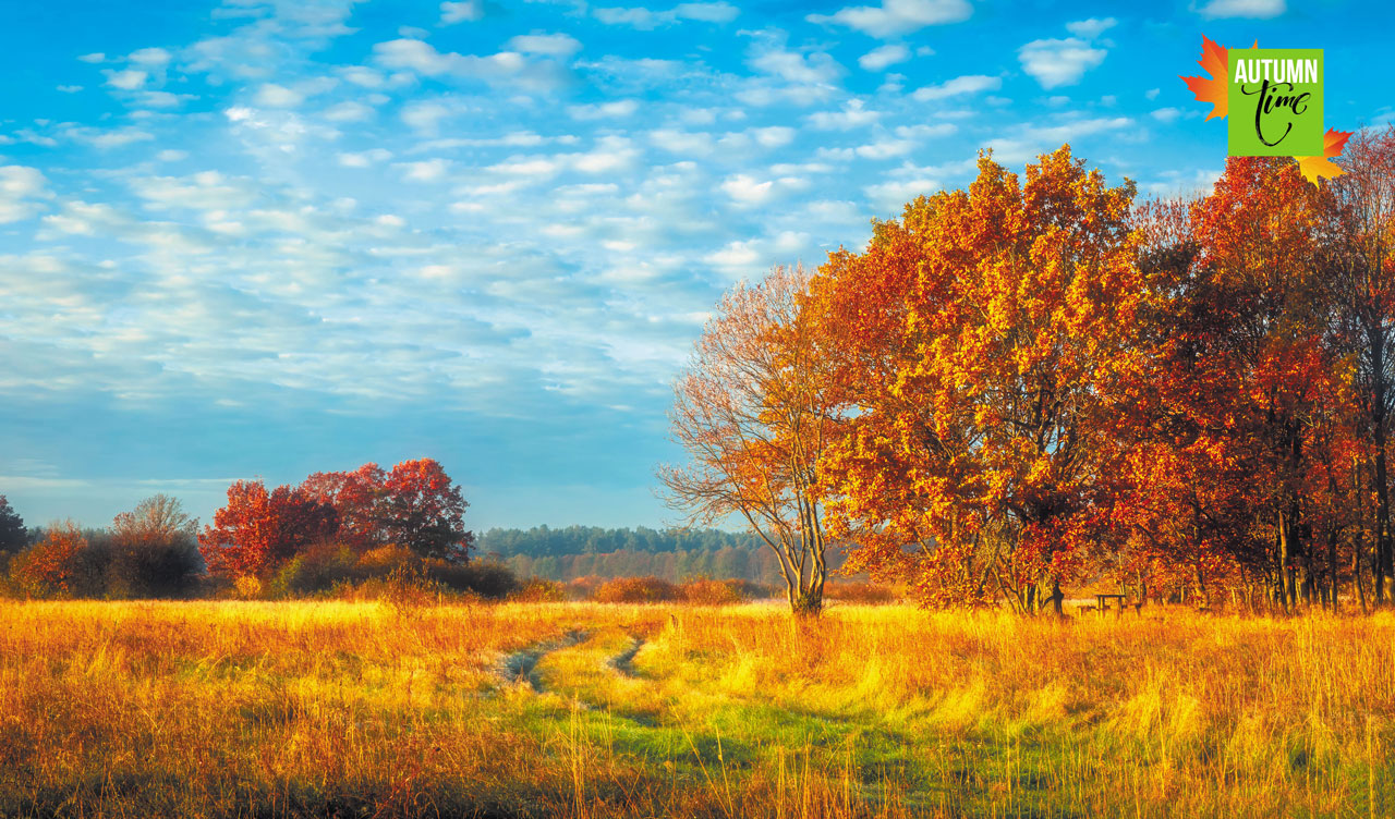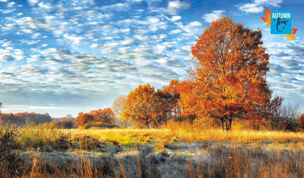 2. Autumn landscape with vivid trees against patchy clouds in the blue sky