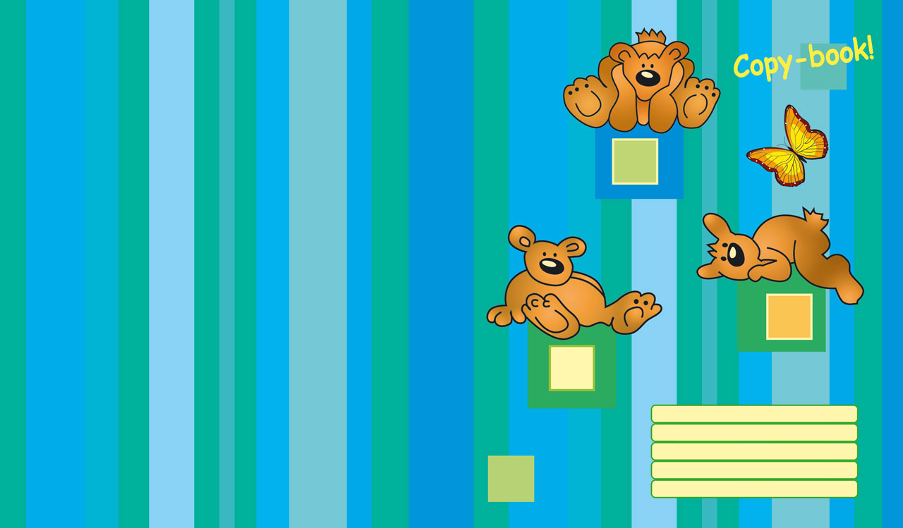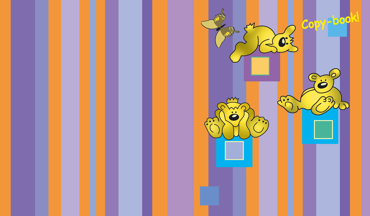 1. Three bears rest on squares on vertical striped green yellow orange pattern