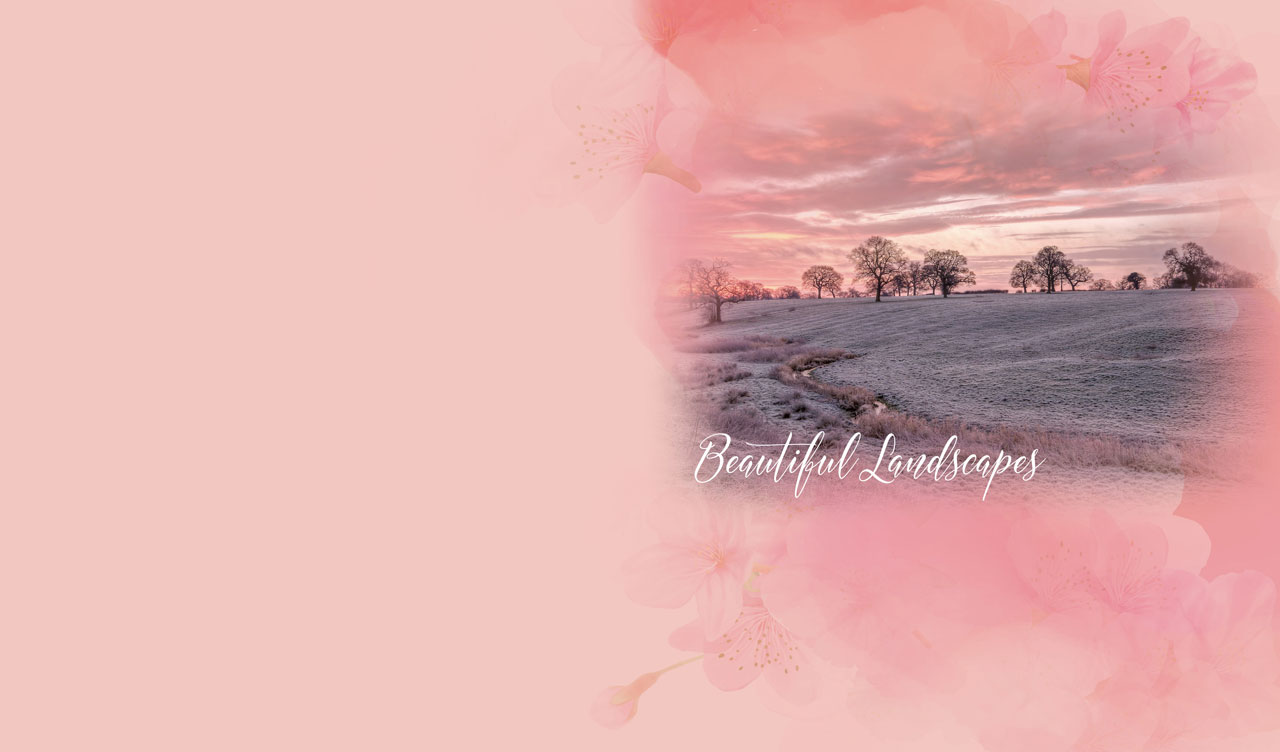 1. Beautiful landscape with trees by a lake in a pastel pink-beige vignette 2. Beautiful landscape with a snowy meadow at twilight in a pastel pink vignette 3. Beautiful landscape with a winter river in a pastel navy vignette 4. Beautiful landscape with a summer meadow at dawn in a pastel fuchsia vignette 5. Beautiful landscape with a lighthouse by the sea in a pastel purple vignette