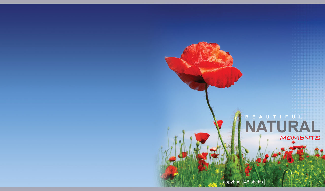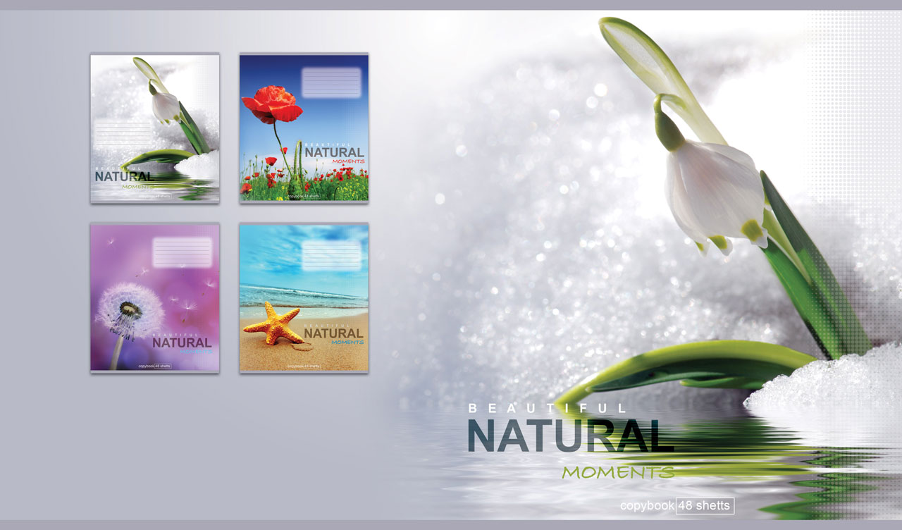 1. Red poppy with a green bud against a field of red poppies and a clear blue sky 2. White dandelion with scattered cotton-like seeds against a purple bokeh backdrop 3. Starfish on ocher beach sand against the sea waves and a cloudy light blue sky 4. White tender snowdrop against the sparkling melting snow
