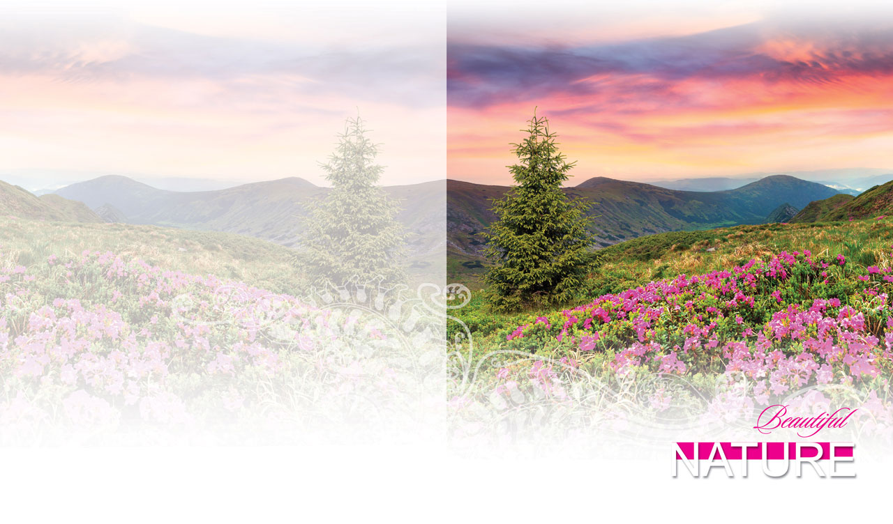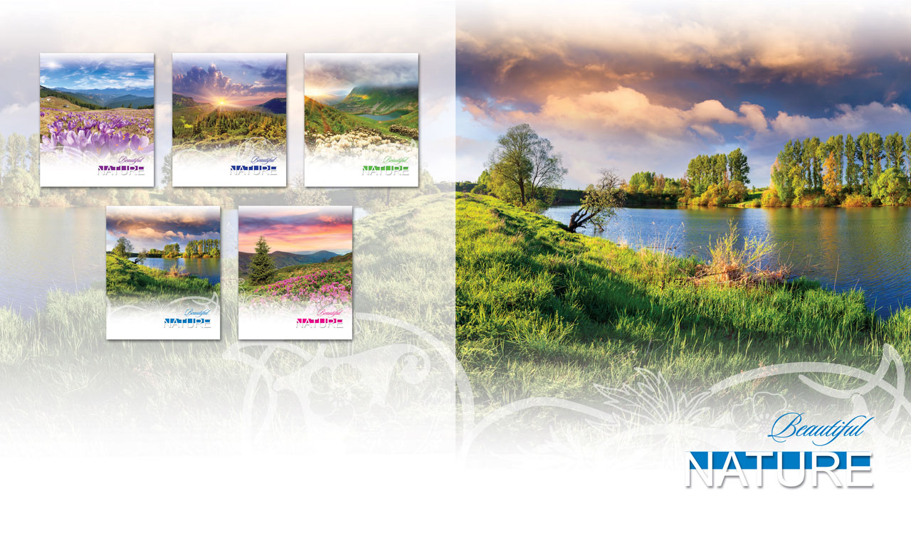 1. Green spruce in a valley of pink wildflowers on pastel white floral backdrop 2. Valley of purple crocuses on pastel white floral backdrop 3. Green conifer forest in a valley at sunrise on pastel white floral backdrop 4. Wildflowers on a green hill and a mountain lake on pastel white floral backdrop 5. Lake view with side light on pastel white floral backdrop