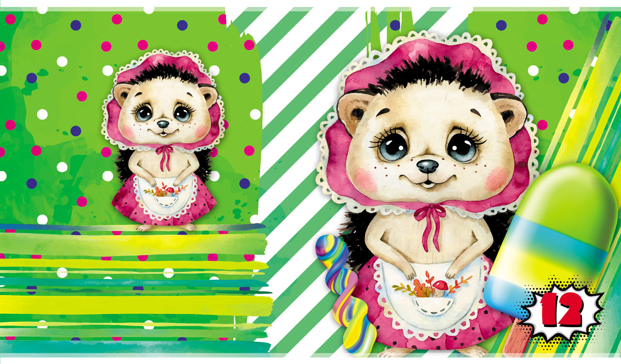 5. Watercolor plush hedgehog in vintage bonnet and apron on a green wrapping paper