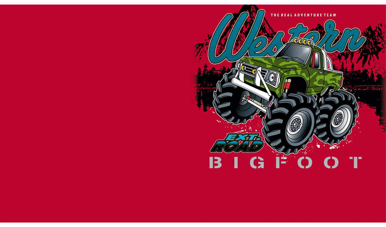 1. Brooklyn and a blue monster truck logo on a violet backdrop 2. Red cruiser monster truck logo on a dark yellow-green backdrop 3. Western and a camouflage monster truck logo on a red backdrop 4. Nature and a blue and white monster offroader logo on a teal backdrop 5. Road 45 and a red monster truck logo on a blue backdrop
