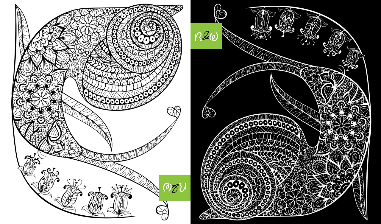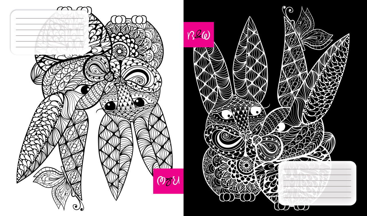 1. Zentangle lions in headdresses of feathers on black and white backdrops 2. Seamless stencils of zentangle ants on black and white backdrops 3. Zentangle abstract snails and bellflowers on black and white backdrops 4. Zentangle pair of bunnies and a butterfly on black and white backdrops