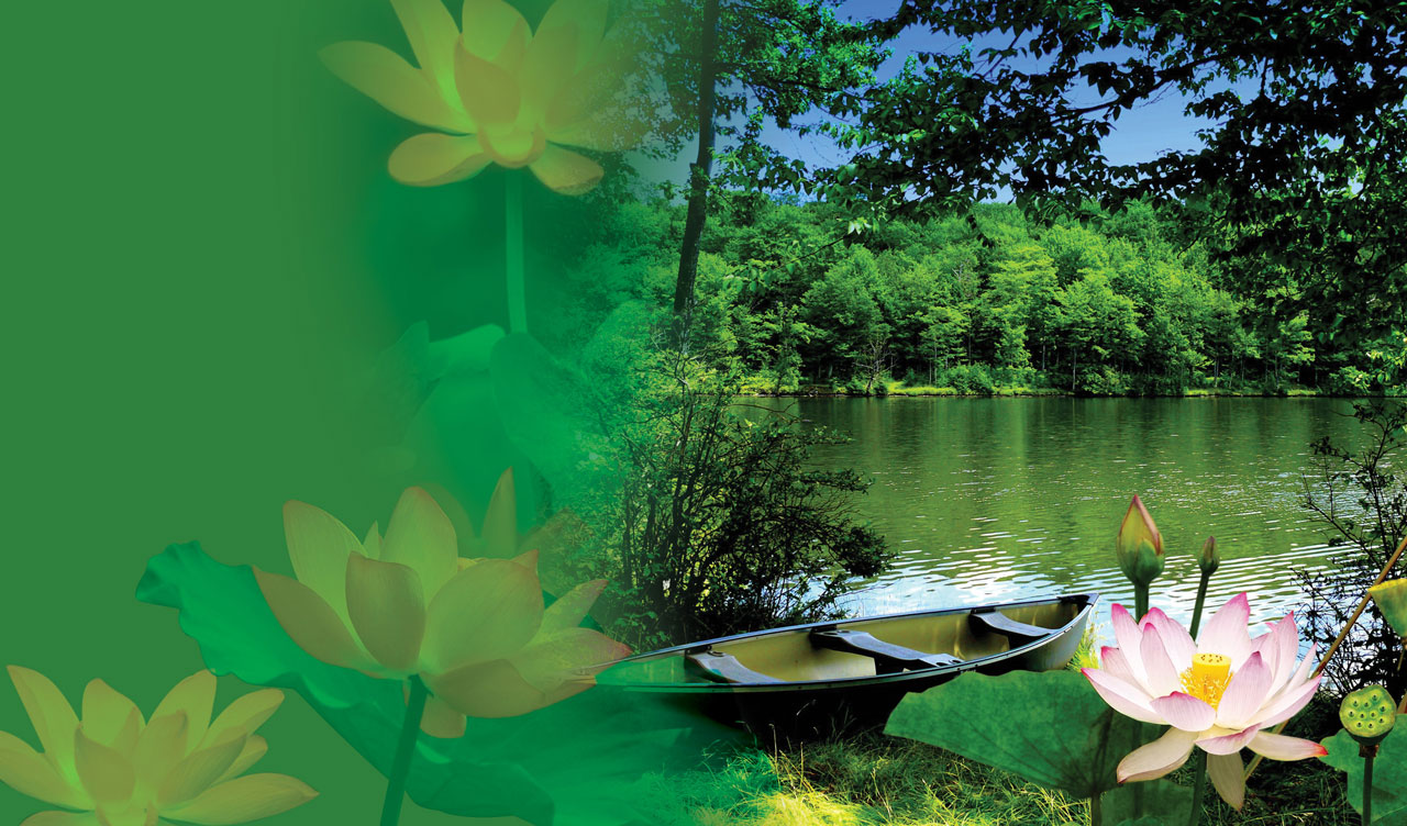 1. Pink lilies in the foreground of a green tree on the bank of a misty white river