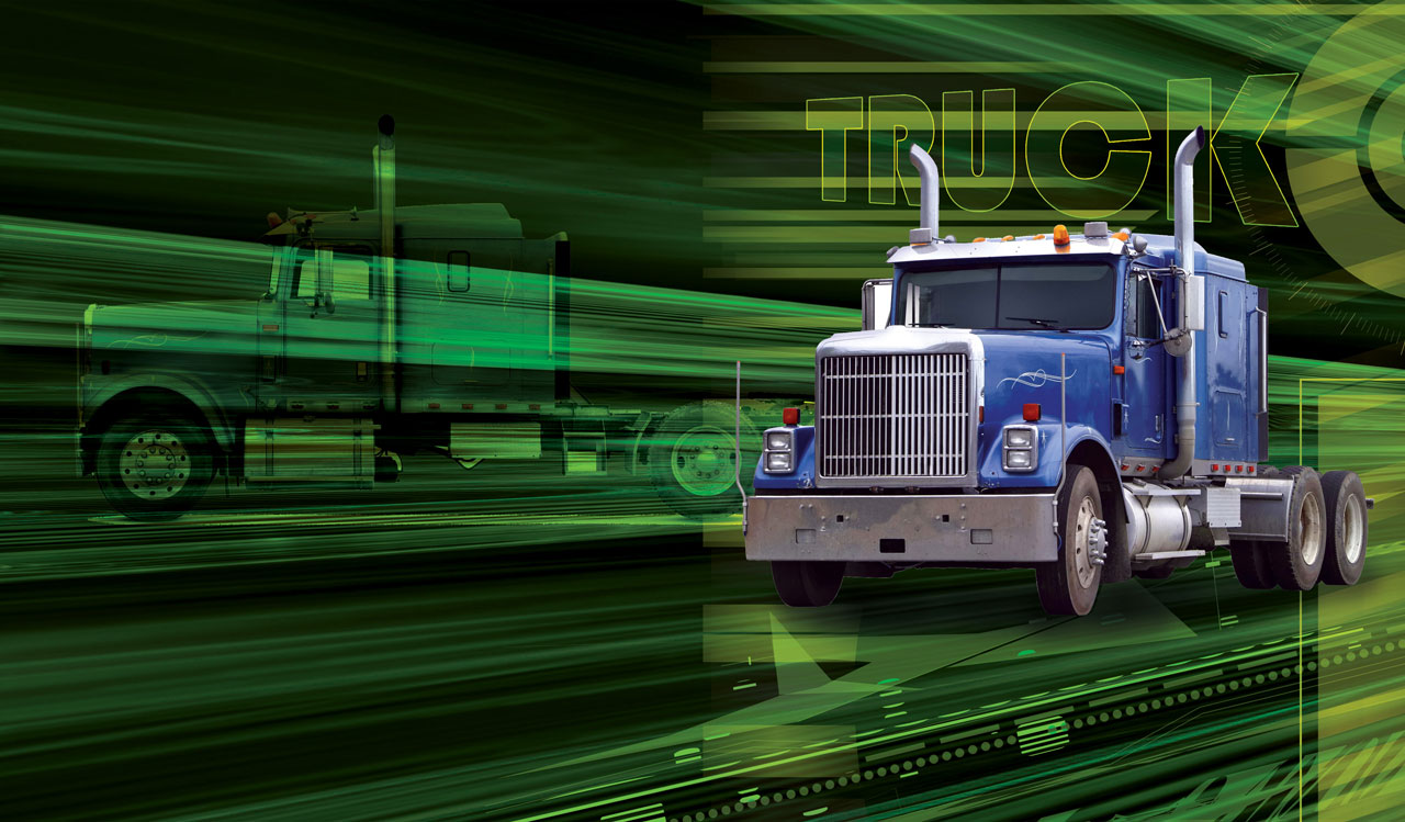 Blue american truck without trailer on the go, on green and black blurred lines background.