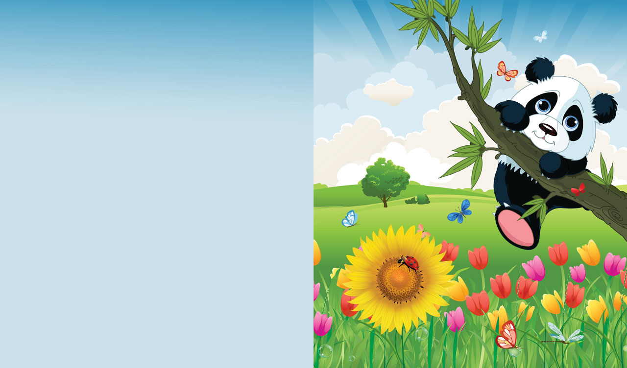 1. Cartoon little giraffe on a green lawn on a light blue sunny day 2. Cartoon little panda hanging on a bamboo branch on a light blue sunny day 3. Cartoon red squirrel holds an acorn on a green lawn on a light blue sunny day 4. Cartoon little elephant on a green lawn of dandelions on a light blue sunny day