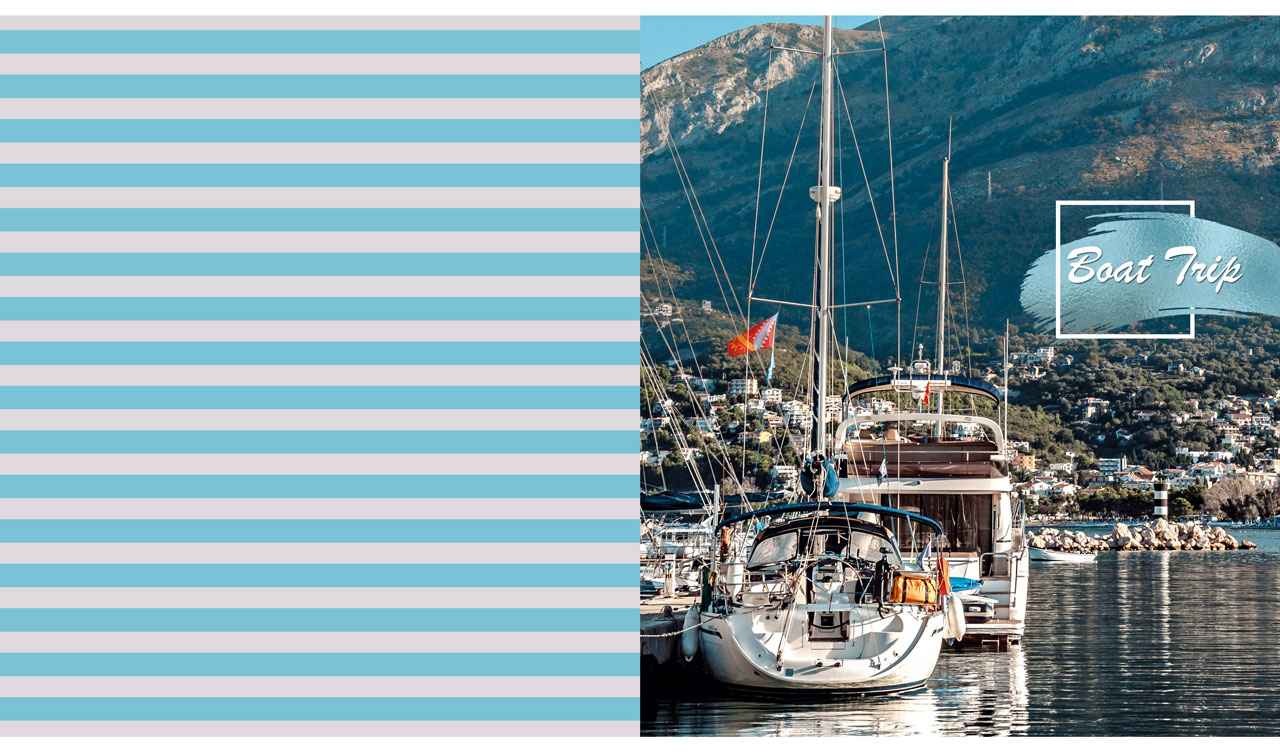 1. Close-up view on a moored sailboat on pastel pink and grey striped backdrop 2. Back view on two moored sailboat on pastel blue and grey striped backdrop 3. An old fishing boat in the sun rays on a pastel beige and gray striped backdrop 4. Front view on a two moored motorboats on a pastel teal and gray striped backdrop 5. Moored sailboats against mountains on a pastel pink and gray striped backdrop