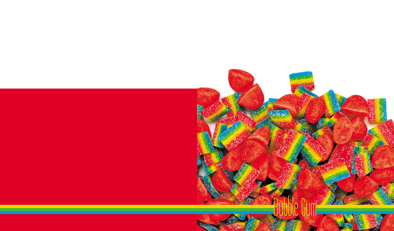 3. Vivid assorted candies and bubble gums spread out on a white and red backdrop