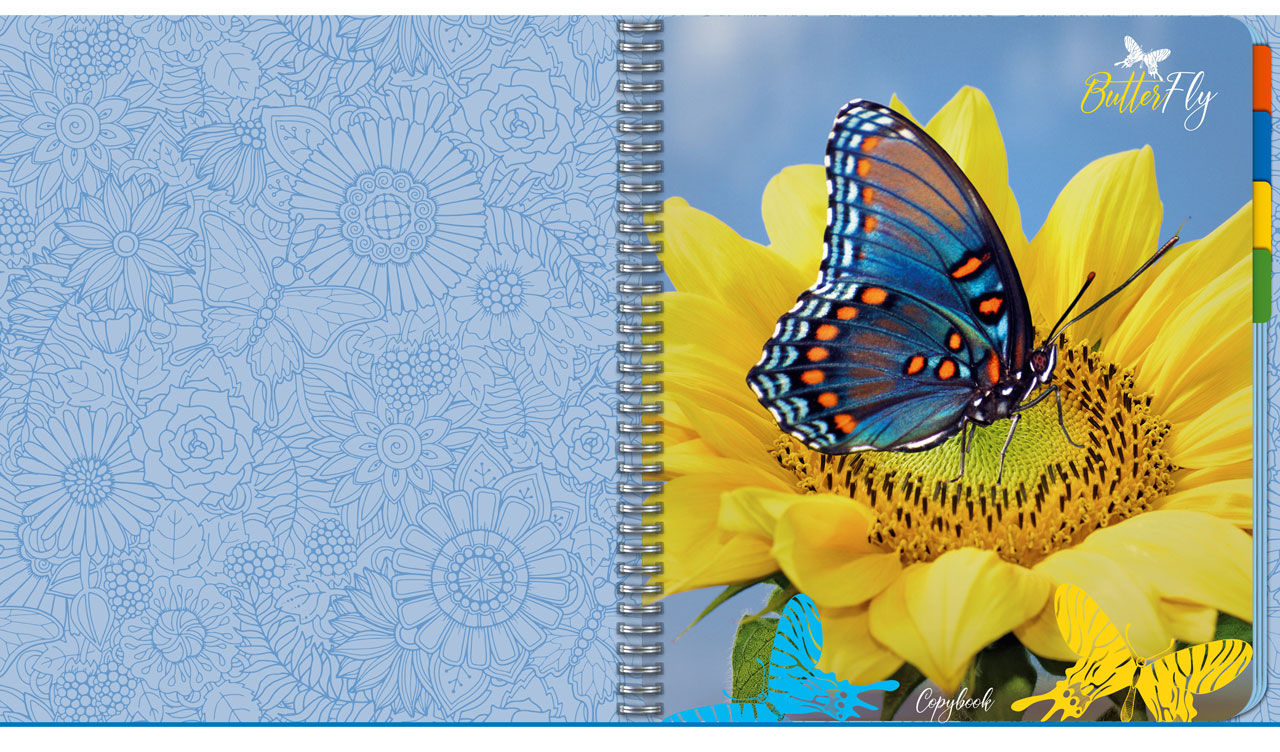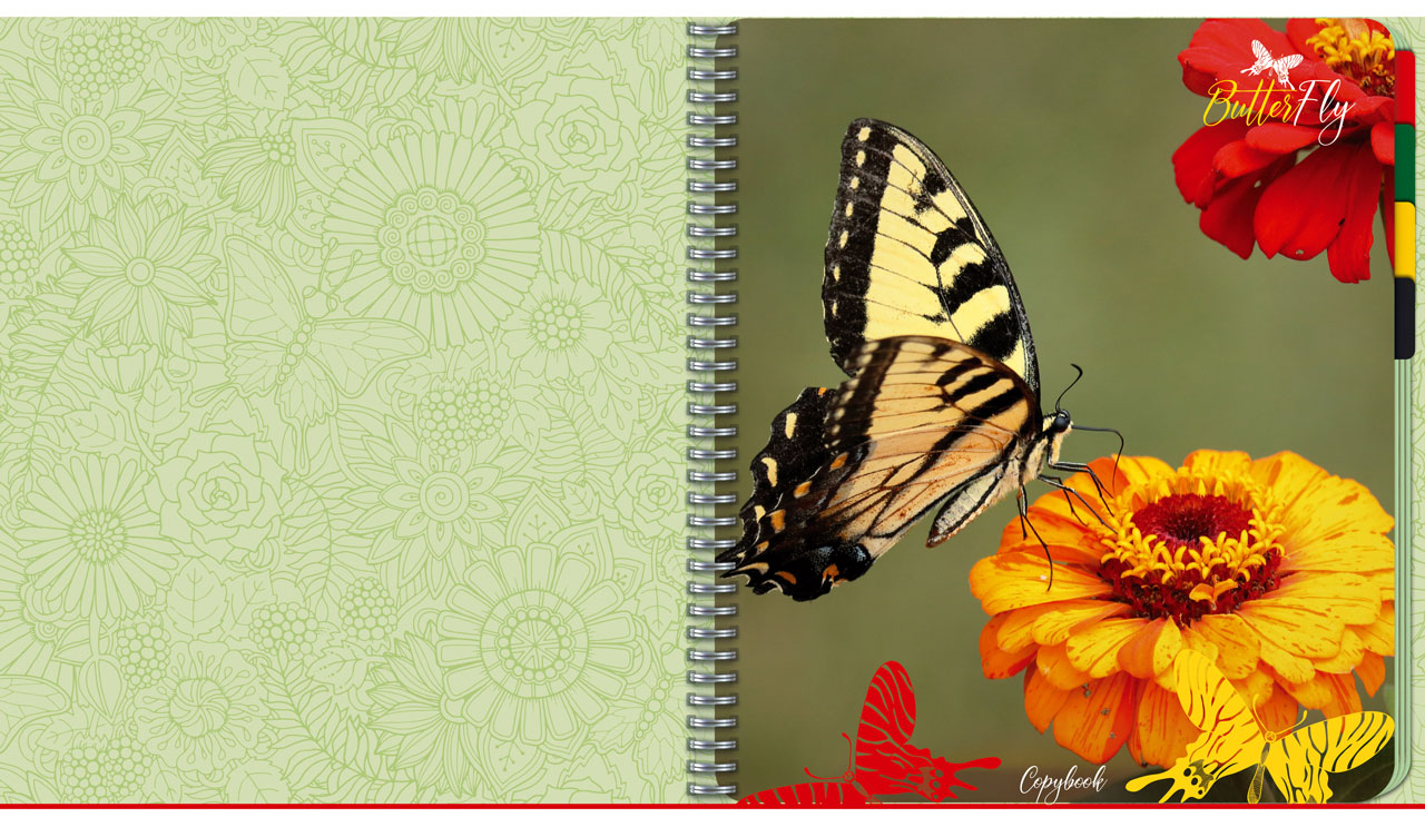 1. A butterfly and vivid flowers on a pastel green cover of a spiral notebook 2. A butterfly and spikelets on a pastel purple cover of a spiral notebook 3. A butterfly and a yellow flower on a pastel blue cover of a spiral notebook 4. Monarch butterfly and flowers on a blush pink cover of a spiral notebook 5. Butterfly and wildflowers on a pastel green cover of a spiral notebook