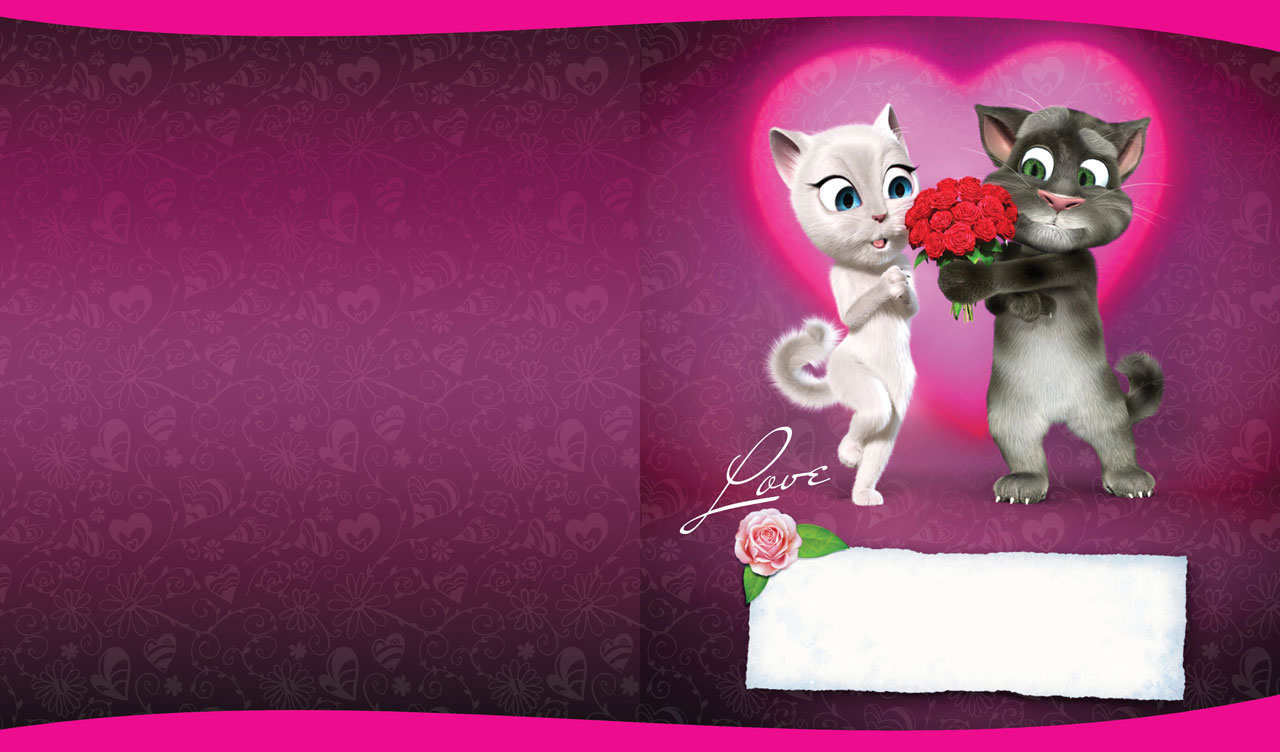 Cartoon grey male cat gives a bouquet of roses to an excited white lady cat on a purple backdrop with floral and heart patterns.