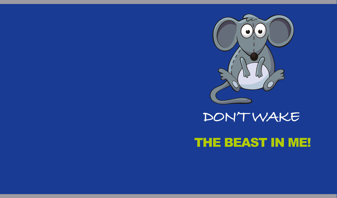 Gray cartoon mouse with big round eyes against a royal blue monochrome with a funny DON’T WAKE THE BEAST IN ME! expression.