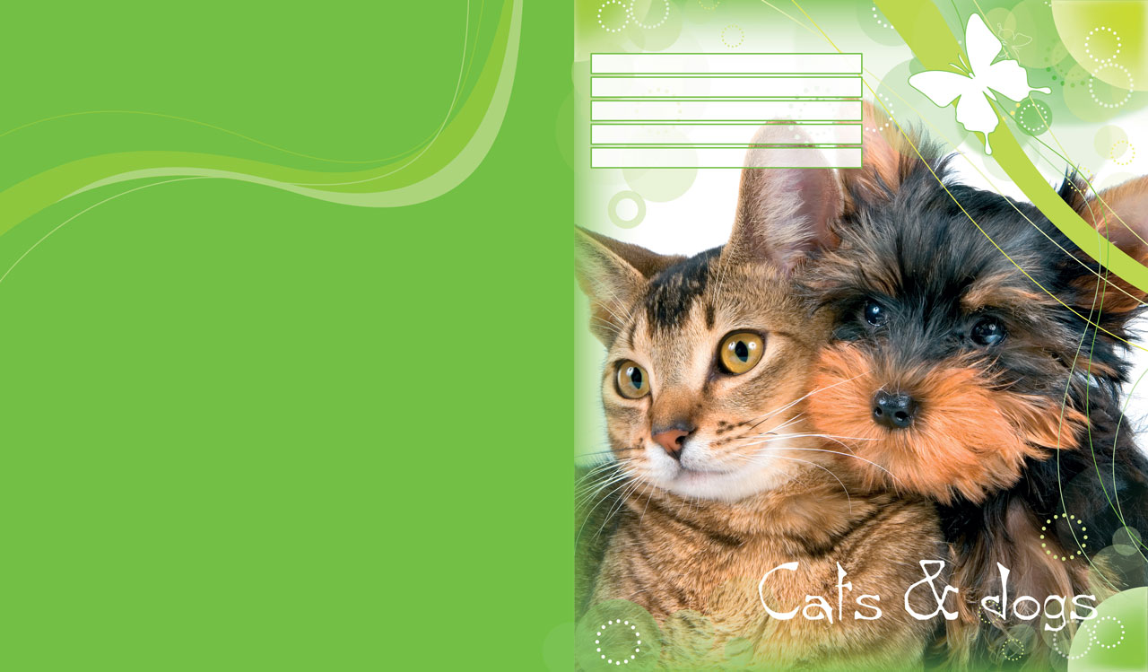2. Tabby cat and furry black brown dog in warm hug cuddling on a green background