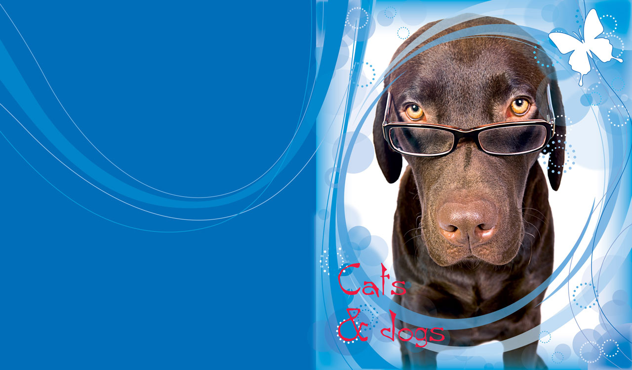 3. Brown dog with long ears and in eyeglasses on blue decorated background