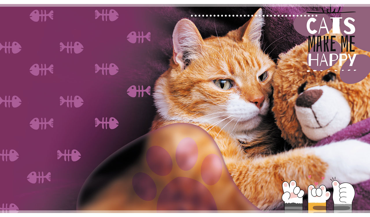 Close-up of a red cat with a teddy bear against a purple background