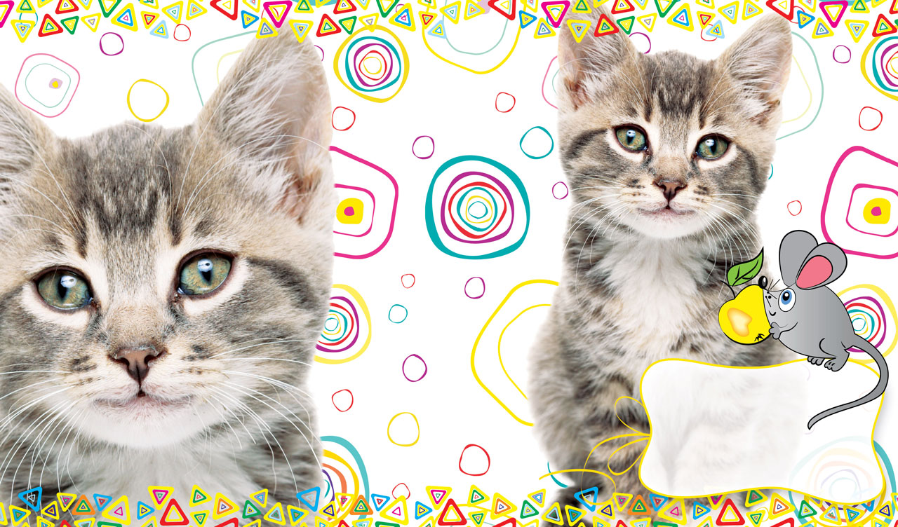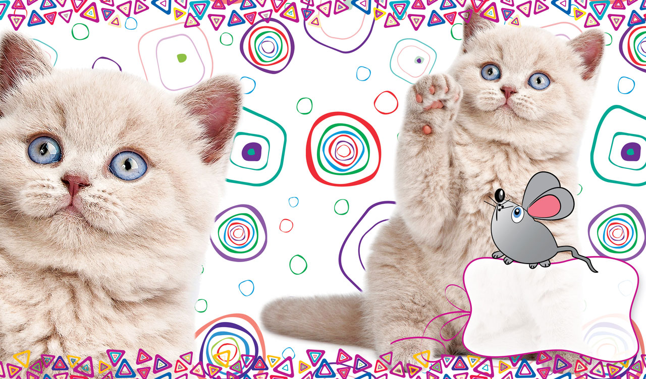1. Surprised ginger kitten with eyes wide open and a cartoon mouse on circle and triangle pattern 2. White kitten with blue eyes, its paw up and a cartoon mouse in anticipation on white 3. Striped gray good natured kitten with a cartoon gray mouse on triangle pattern 4. Thoughtful black kitten with blue eyes with cartoon gray mouse on circle pattern