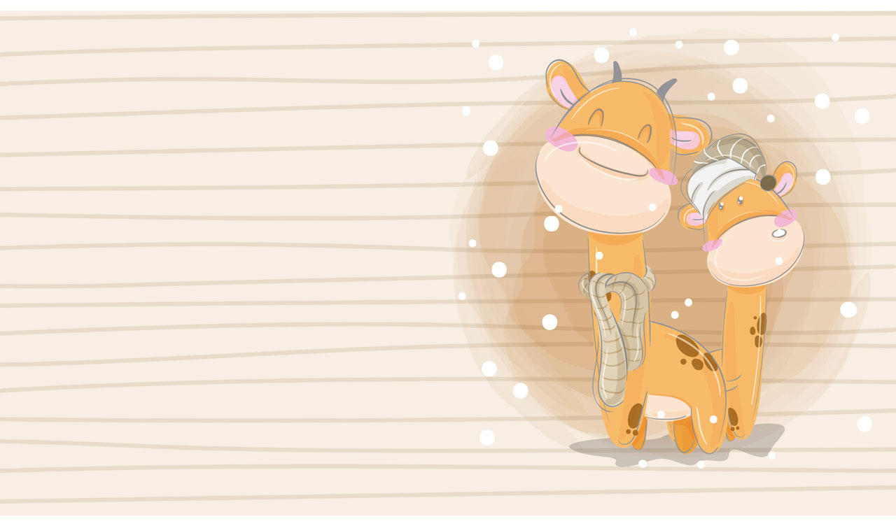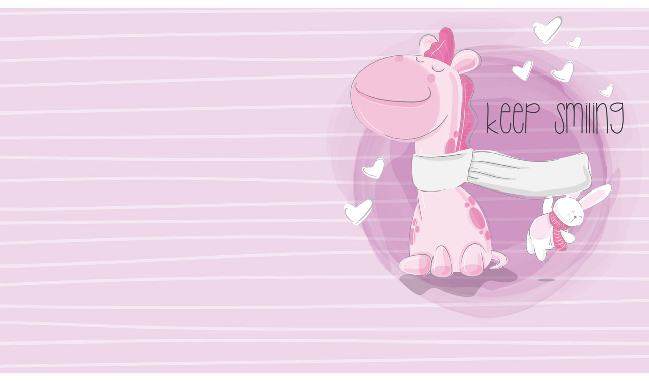 1. A pair of cartoon giraffes on a seamless striped pattern on pastel beige 2. A cartoon bunny sleeping on a cow on a seamless striped pattern on pastel pink 3. Cartoon smiling giraffe and bunny on a seamless striped pattern on pastel purple 4. Two cartoon cats on a coffee break on a seamless striped pattern on pastel beige 5. A cartoon fox in a war bonnet on a seamless striped pattern on pastel teal