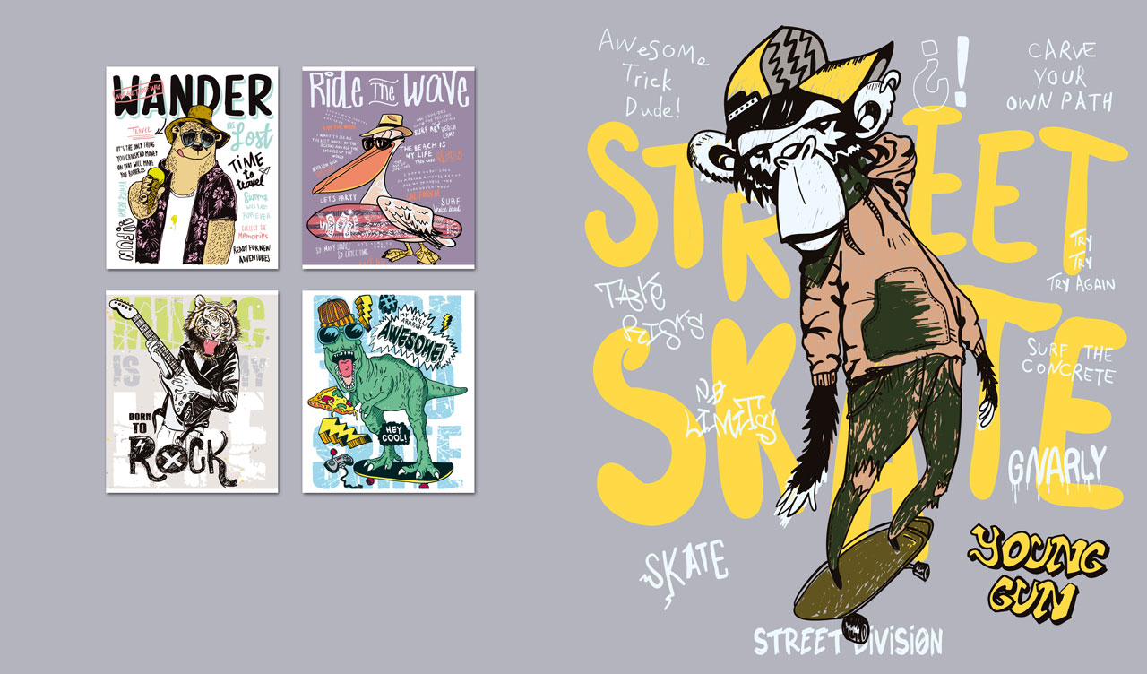 1. Tiger guitarist born to rock on a pastel white poster 2. Surfer pelican ready to ride the wave on a pastel purple poster 3. Bear tourist ready for new adventures on a white poster 4. Street skate ape on a pastel grey poster 5. T. Rex skater born to skate on a white poster