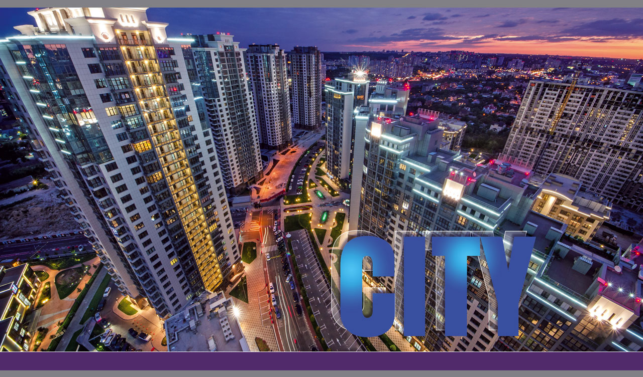 4. Night view of illuminated skyscrapers against the violet sky in Kyiv, Ukraine