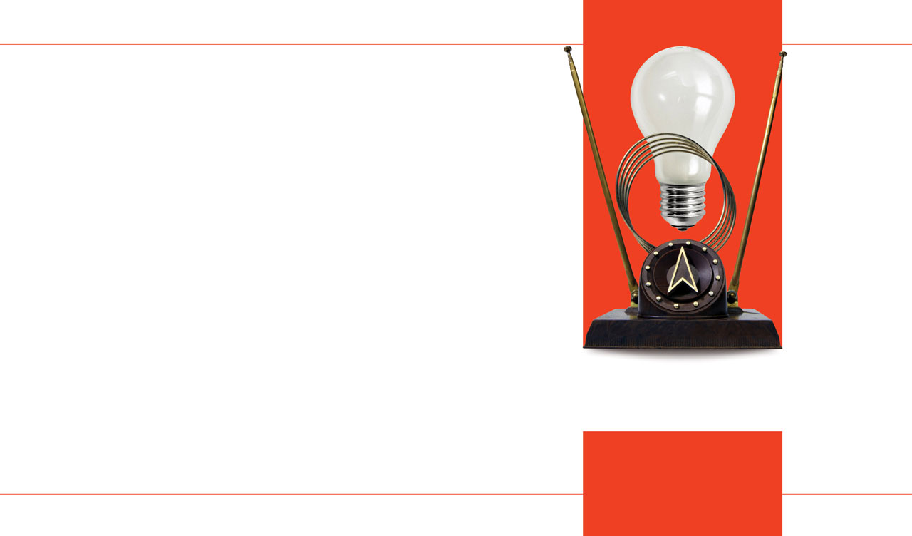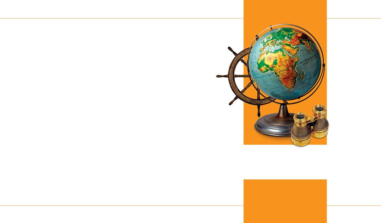 1. Hourglass with grey sand with an antique statue of a nymph on a lime panel 2. A wooden brown helm, a globe and a vintage binocular on an orange panel 3. A molecular model and a chemical flask with a green substance on a blue panel 4. A light bulb, copper coil and a TV antenna on a red panel