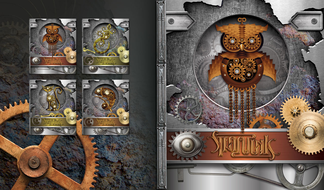 1. Steampunk art with a clockwork chameleon on a gray backdrop with metal gears 2. Steampunk art with a clockwork golden cat on a gray backdrop with metal gears 3. Steampunk art with a clockwork brass lizard on a gray backdrop with metal gears 4. Steampunk art with a clockwork copper owl on a gray backdrop with metal gears