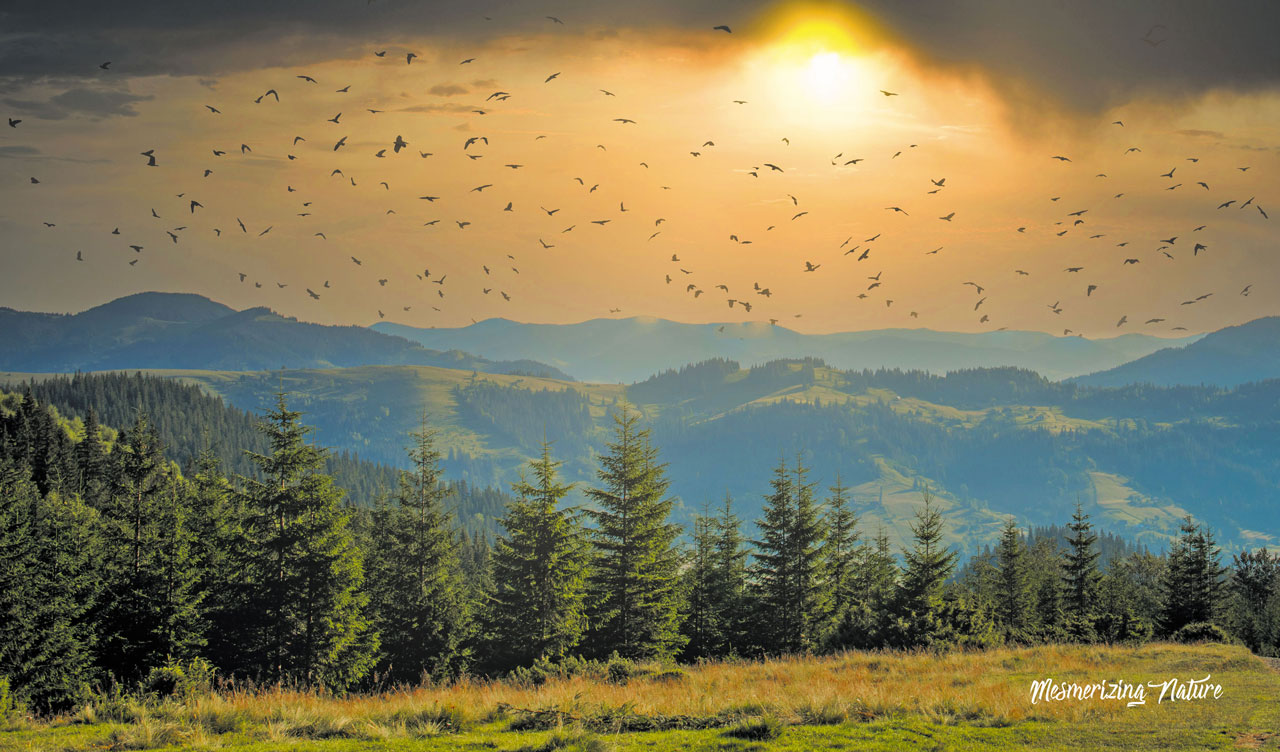 A picturesque landscape with a cloudy sunrise over mountain hills, blanketed in coniferous forest, and birds flying above.