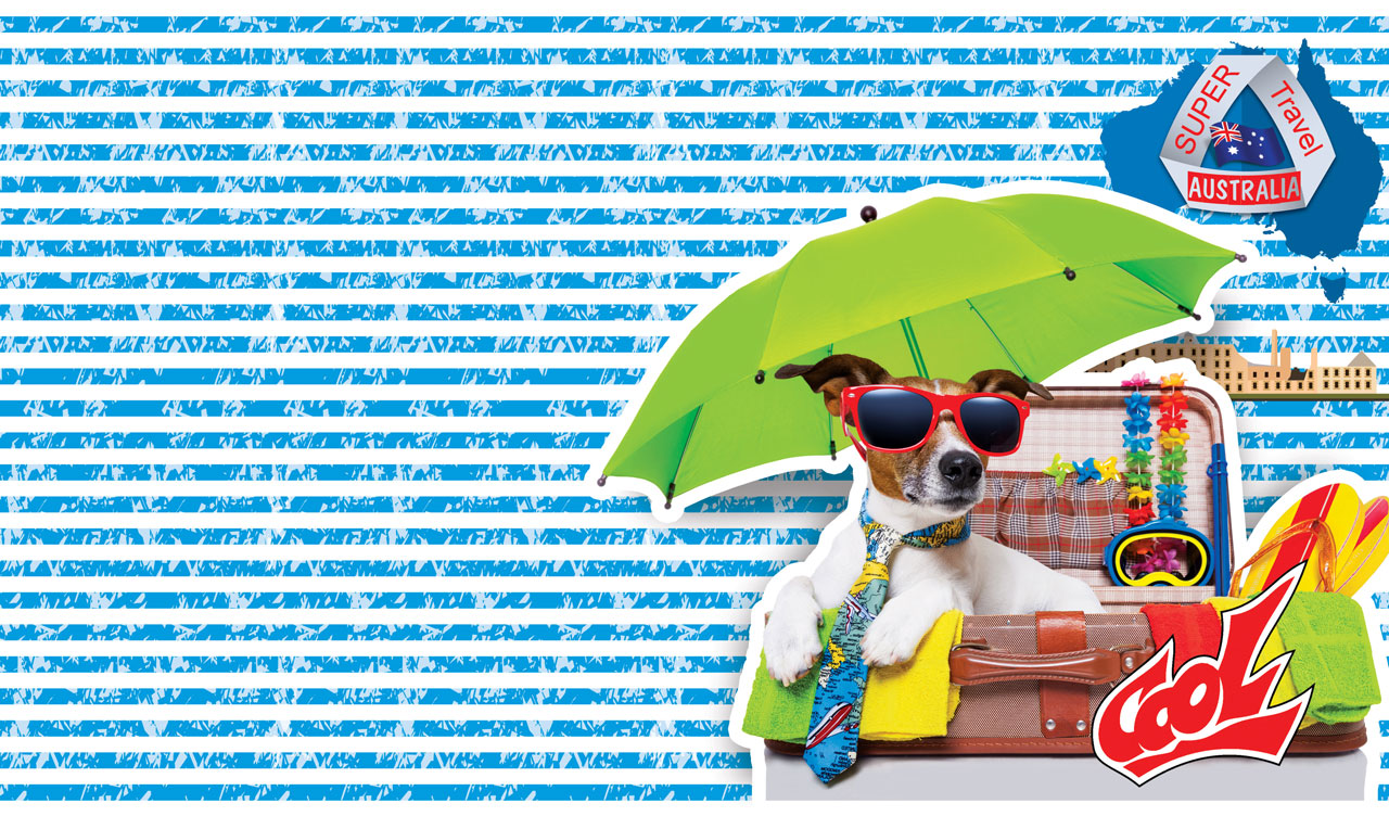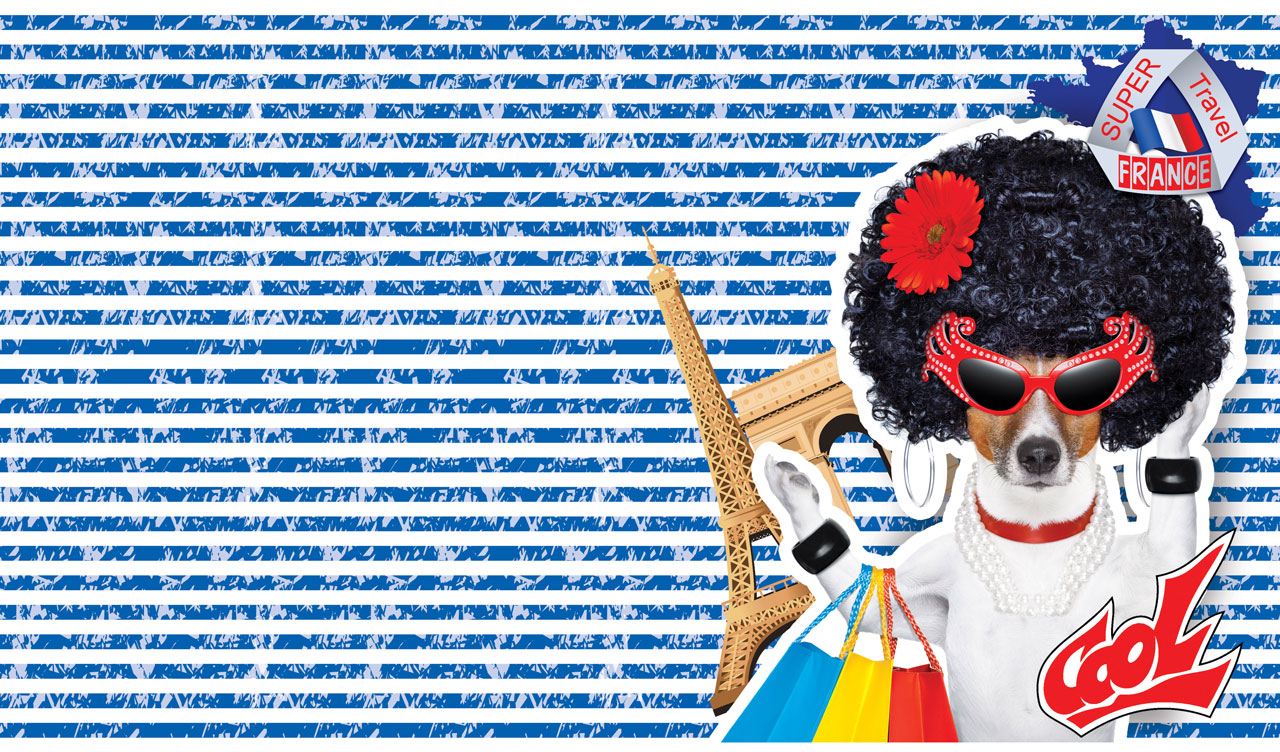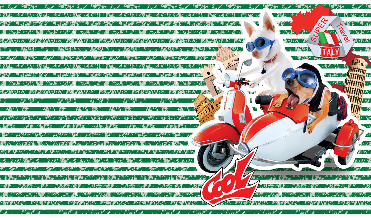 1. Chihuahua couple in a bike with a sidecar against the green and white stripes 2. Jack Russell terrier, poodle-haired, shopping in France against the blue and white stripes 3. Jack Russell terrier on a blue scooter against the navy and white stripes 4. Jack Russell terrier on vacation in Australia against the blue and white stripes