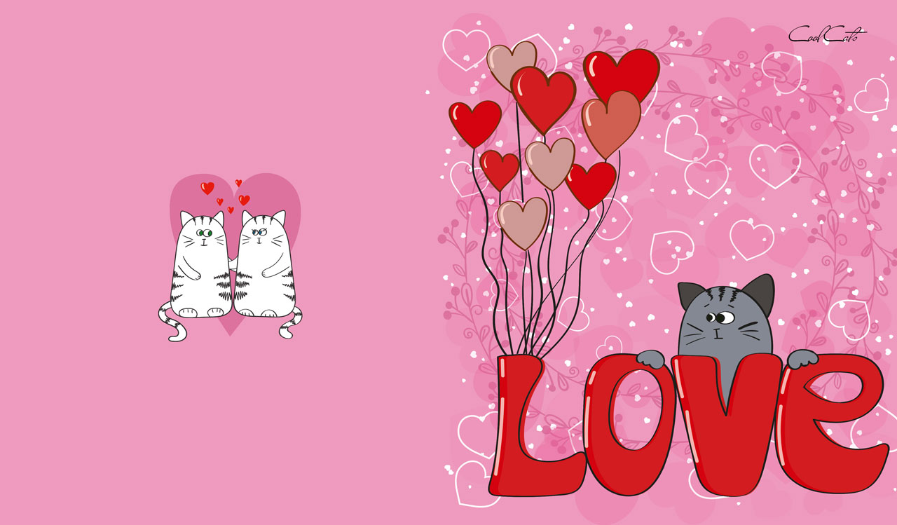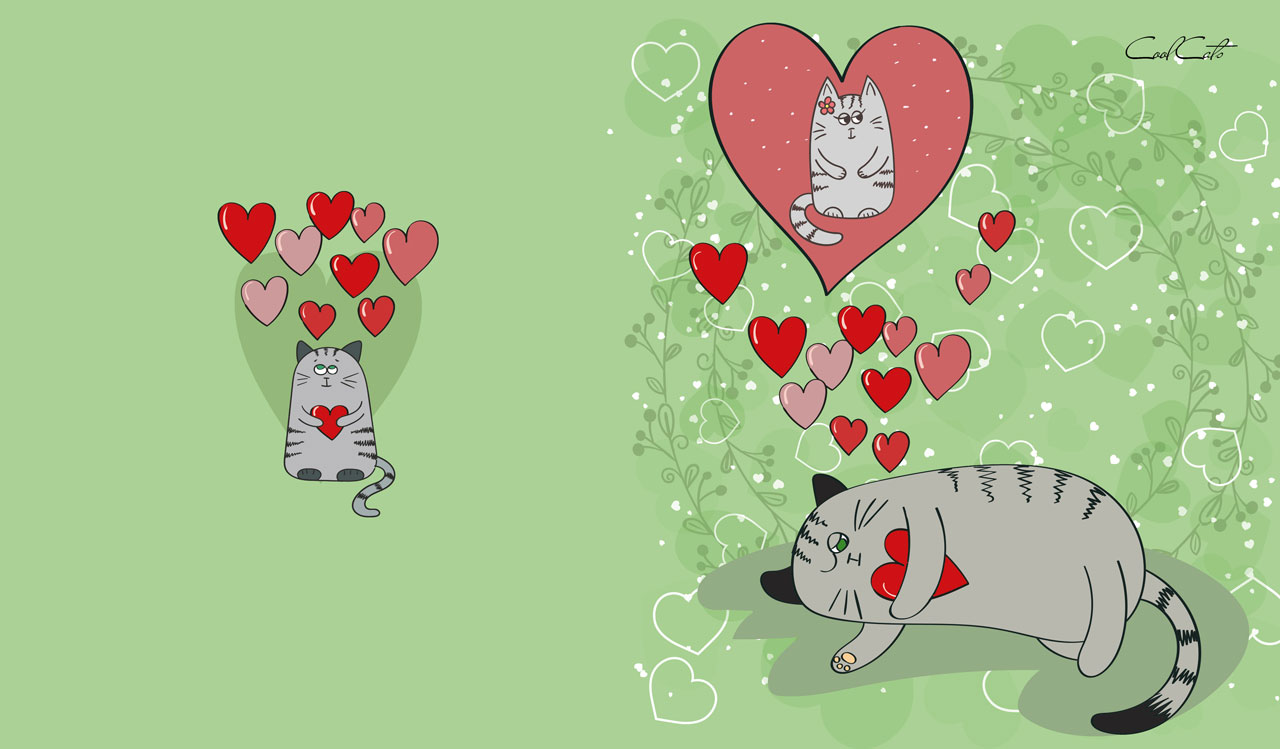 1. A gray cat dreams about love against a pastel green backdrop adorned with hearts 2. Pair of cats on a date against a pastel blue backdrop adorned with hearts 3. Gray cat with red balloons against a pastel pink backdrop adorned with hearts 4. Gray cat sleeps on crescent against a yellow-beige backdrop adorned with hearts 5. White cat in a red aerostat against a pastel navy backdrop adorned with hearts