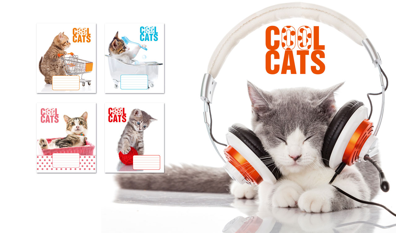 1. Kitten in a bathtub with a blue brush on a white backdrop 2. Kitten in a pink basket on a white backdrop with pink polka dot footer 3. Kitten with a shopping cart on a white backdrop 4. Kitten playing with a red yarn ball on a white backdrop 5. Cat listening to music in white headphones on a white backdrop