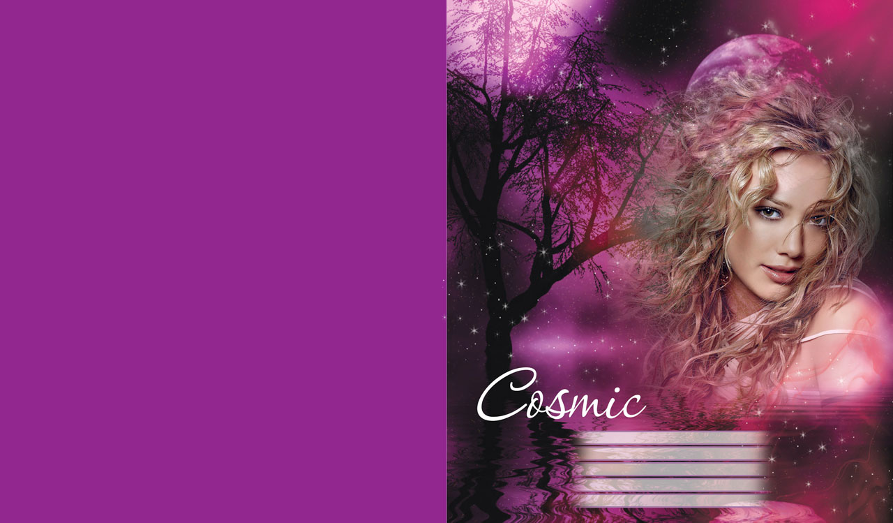 2. Girl with curly blond hair, in a water, with the Moon, stars and trees on purple