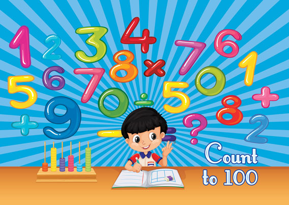 1. A boy and a girl counting to 100 against a blue sunburst backdrop 2. A boy with a notebook and an abacus against a blue sunburst backdrop 3. A girl and two boys holding a number 100 against a sky blue sunburst backdrop 4. Kids and a dog playing with numbers against an orange sunburst backdrop 5. A girl and a boy carry numbers on a cart against a teal sunburst backdrop