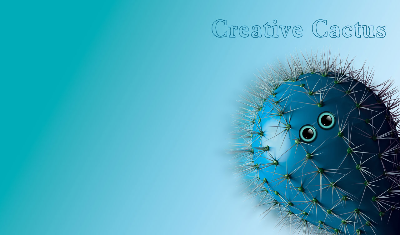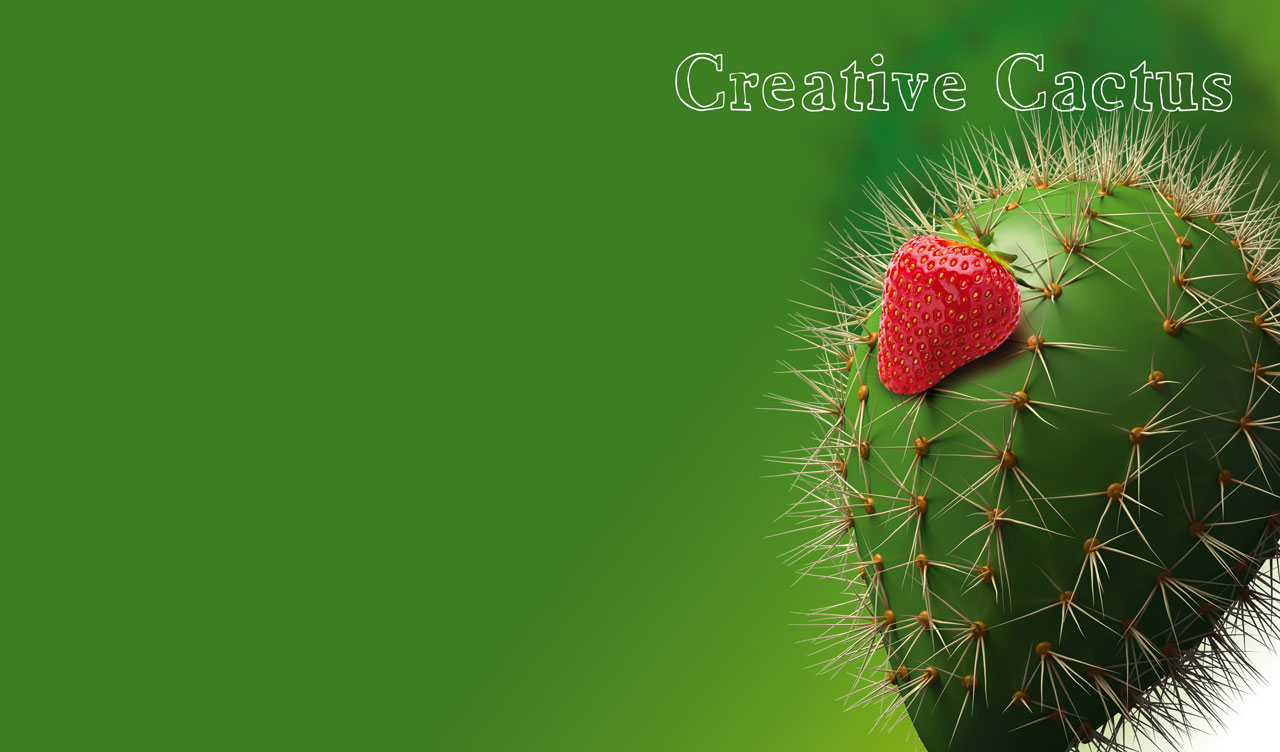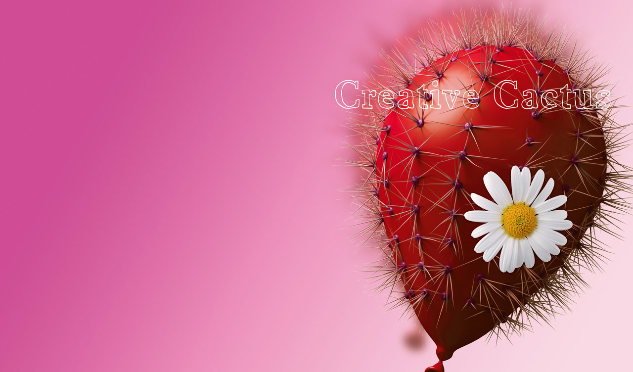 1. Red strawberry on a green cactus on green monochrome backdrop 2. Funny eyes on a blue cactus on a light blue monochrome backdrop 3. White daisy on a red cactus on a pink monochrome backdrop 4. White gerberas on olive cacti on a yellow monochrome backdrop 5. Blue butterfly on a white cactus on a blue monochrome backdrop