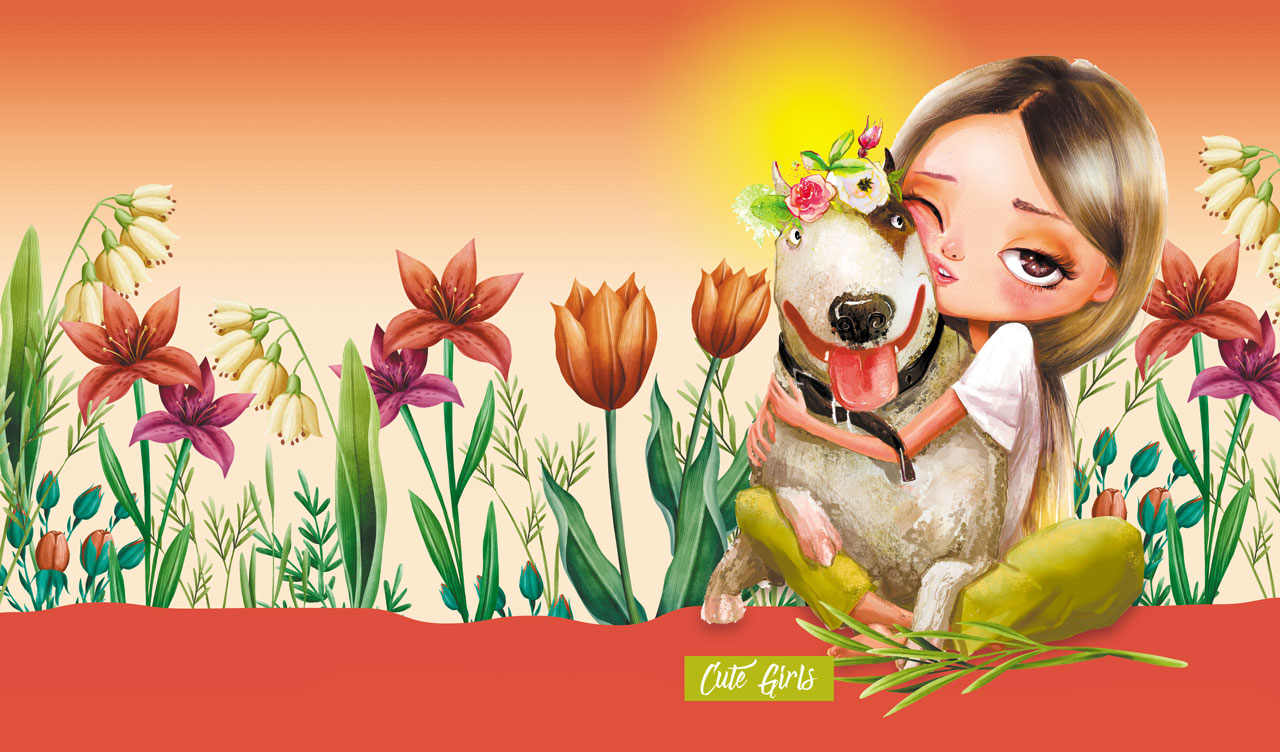 3. Illustration of a little girl hugging a spotted dog amid flowers on orange