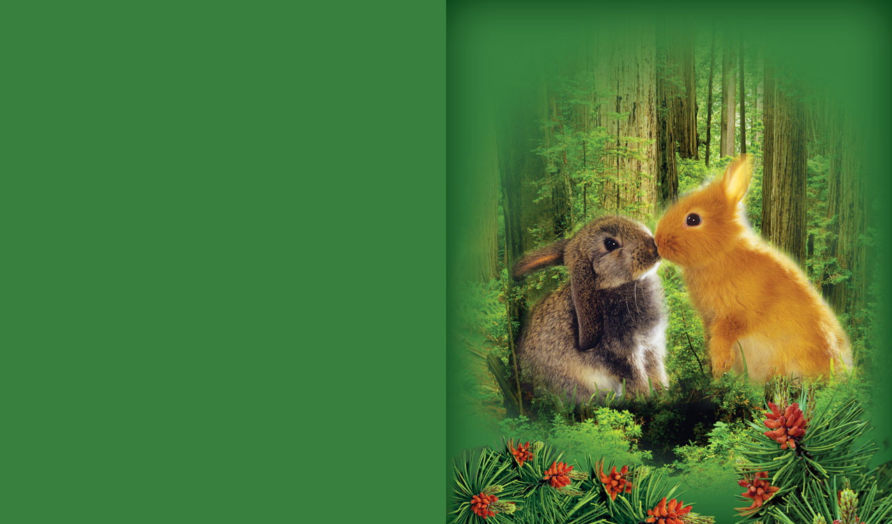 1. Pair of tan rabbits wrapped in the orange rose petals on a blurred pink postcard 2. Pair of white rabbits cuddle in a foggy forest on a navy postcard 3. A ginger rabbit and a grey rabbit kiss in a wild forest on a green postcard 4. Pair of brown and grey rabbits cuddle by the mountain lake on a brown postcard