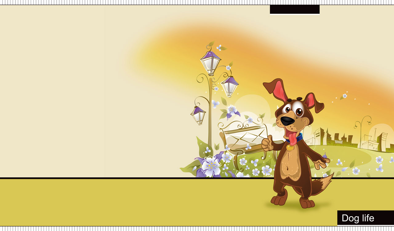 1. Cartoon dog at park on the outskirts of a town on a yellow-ocher gradient