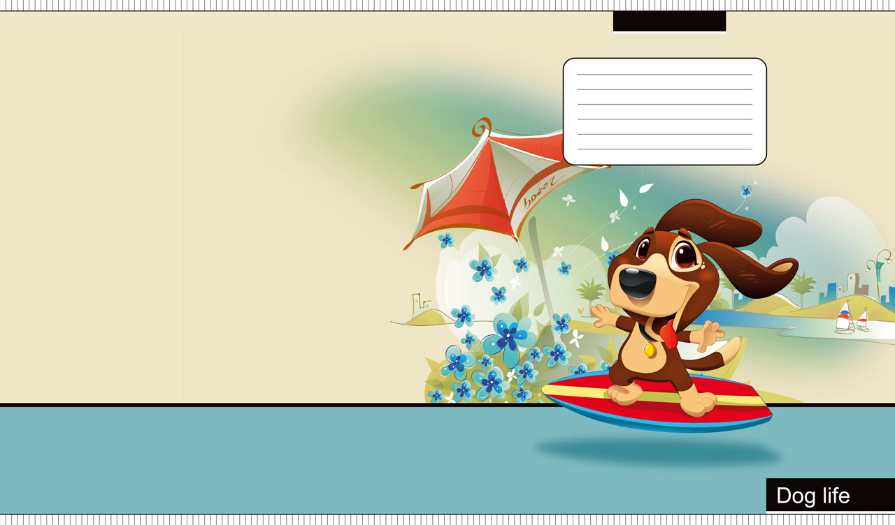 Cartoon dog surfing at a city beach on a beige-teal gradient