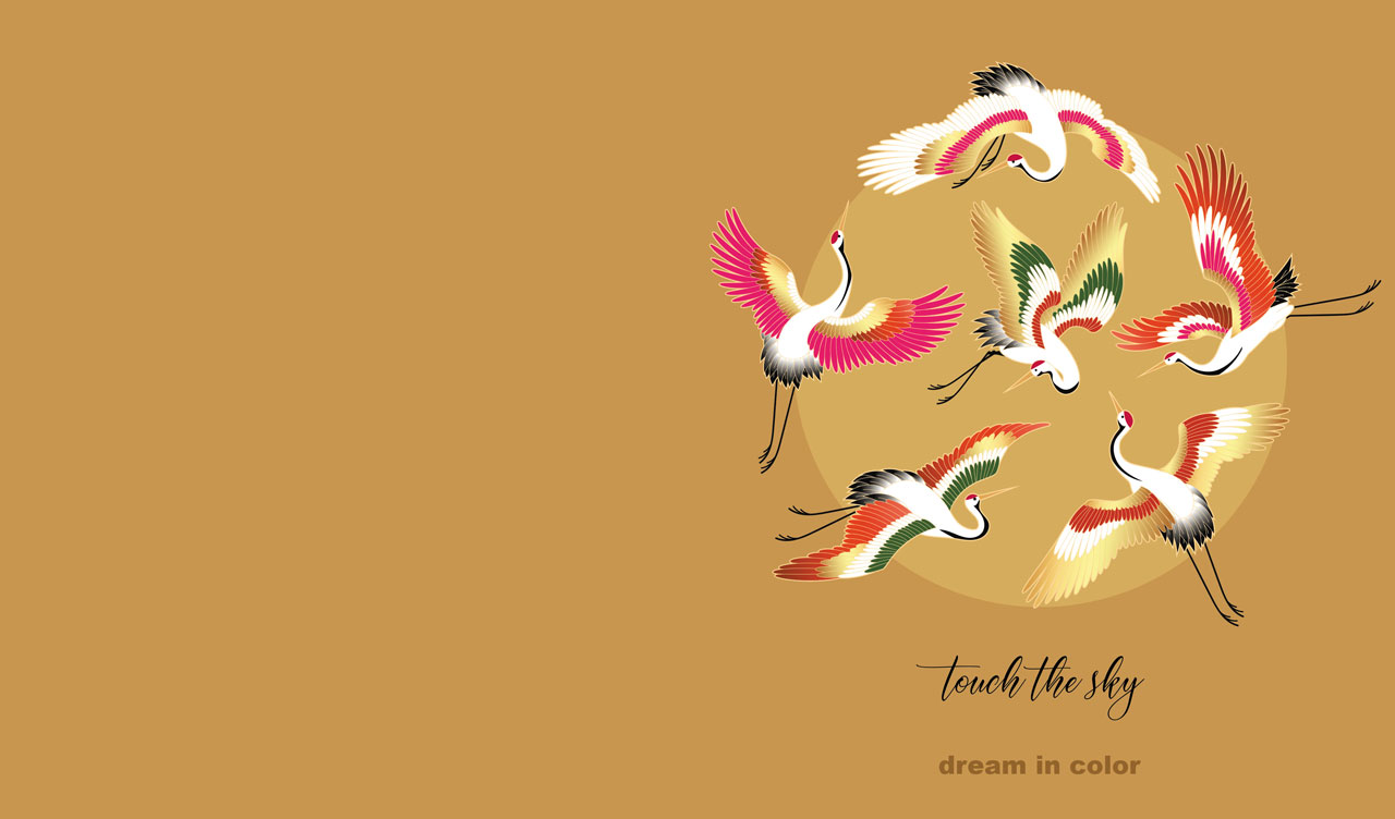 2. Flock of stylized cranes fly against the sun on ocher