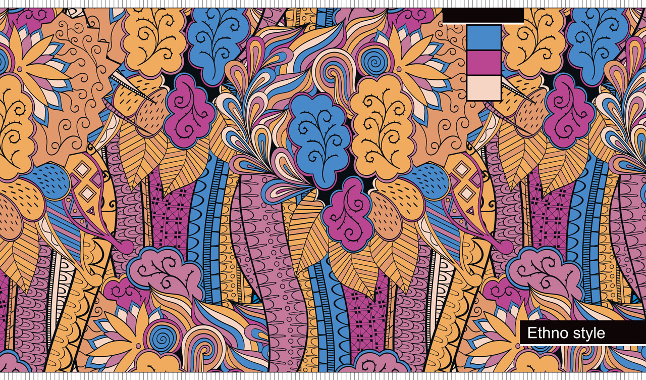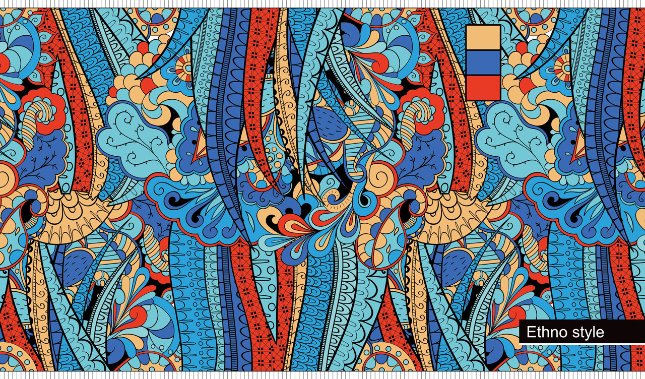 1. Vibrant ethnic Mehndi ornament in blue, teal red and beige colors 2. Vibrant ethnic Mehndi ornament in red, grey, teal and dark blue colors 3. Floral ethnic style seamless pattern in white, red, teal and yellow colors 4. Floral ethnic style seamless pattern in blue, purple, and ocher colors 5. Floral ethnic style seamless pattern in blue and white colors