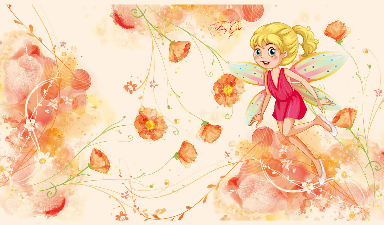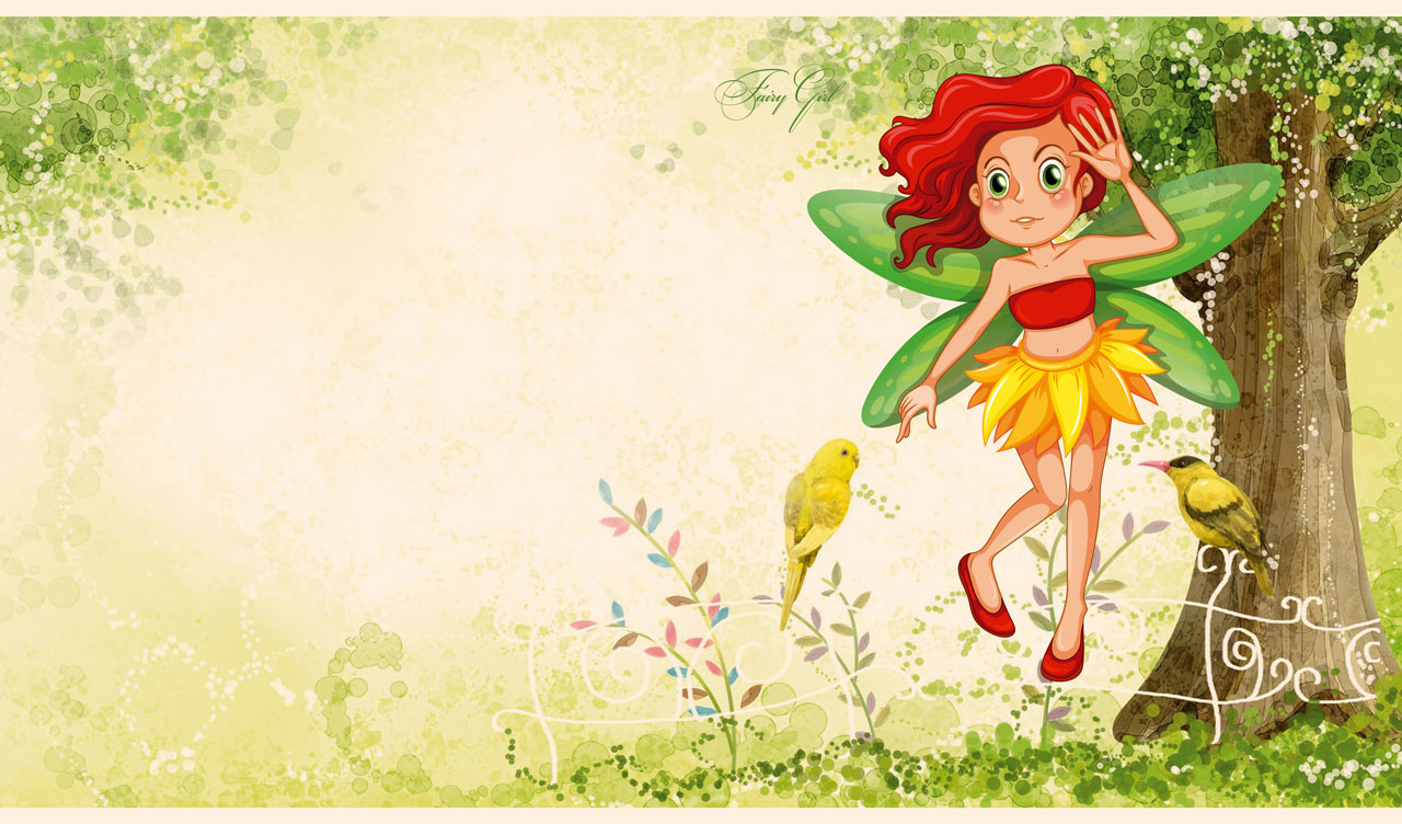 1. Violet-haired fairy flies above a green village in the pastel beige sky 2. Blonde fairy flies among the orange flowers on a pastel beige background 3. Red hair fairy wanders with birds in the pastel green forest 4. Blue-haired fairy flies in the pastel beige-blue night sky talking to the crescent
