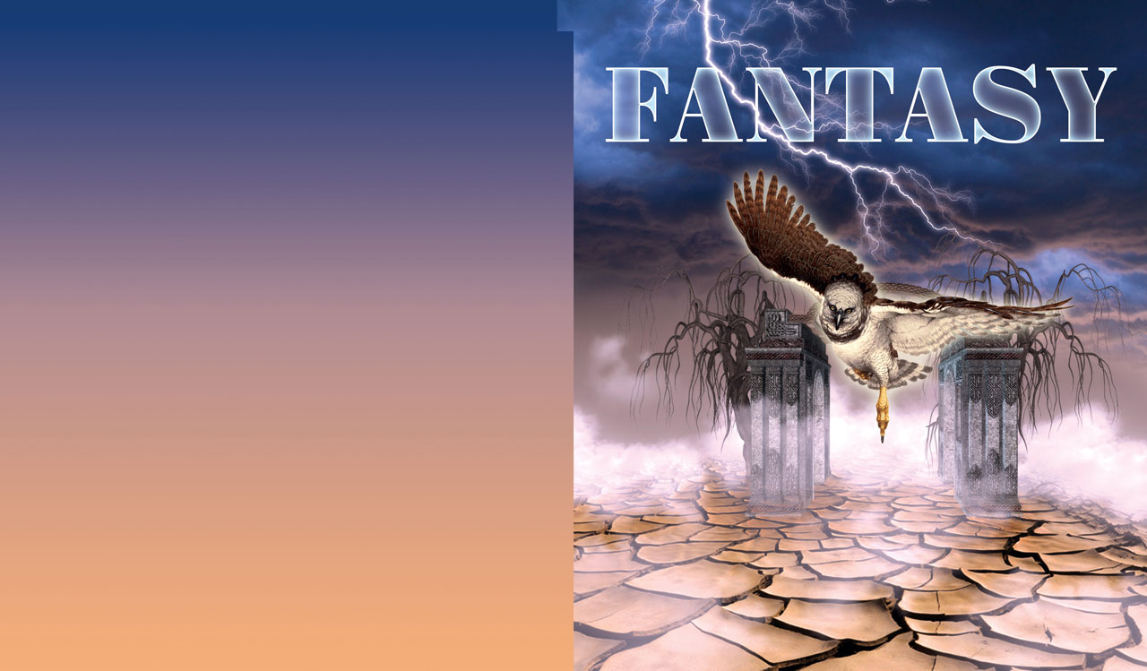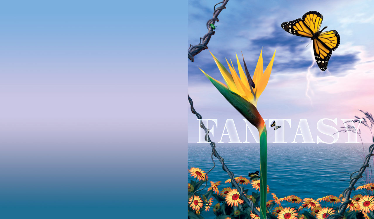 1. Sunflower and autumn leaves in the sunset 2. A fantasy of paradise flower, asters and butterflies by the ocean 3. Owl flies through ancient arches beneath the lightning above the dry land 4. A dolphin emerges from the sea in front of an ancient temple